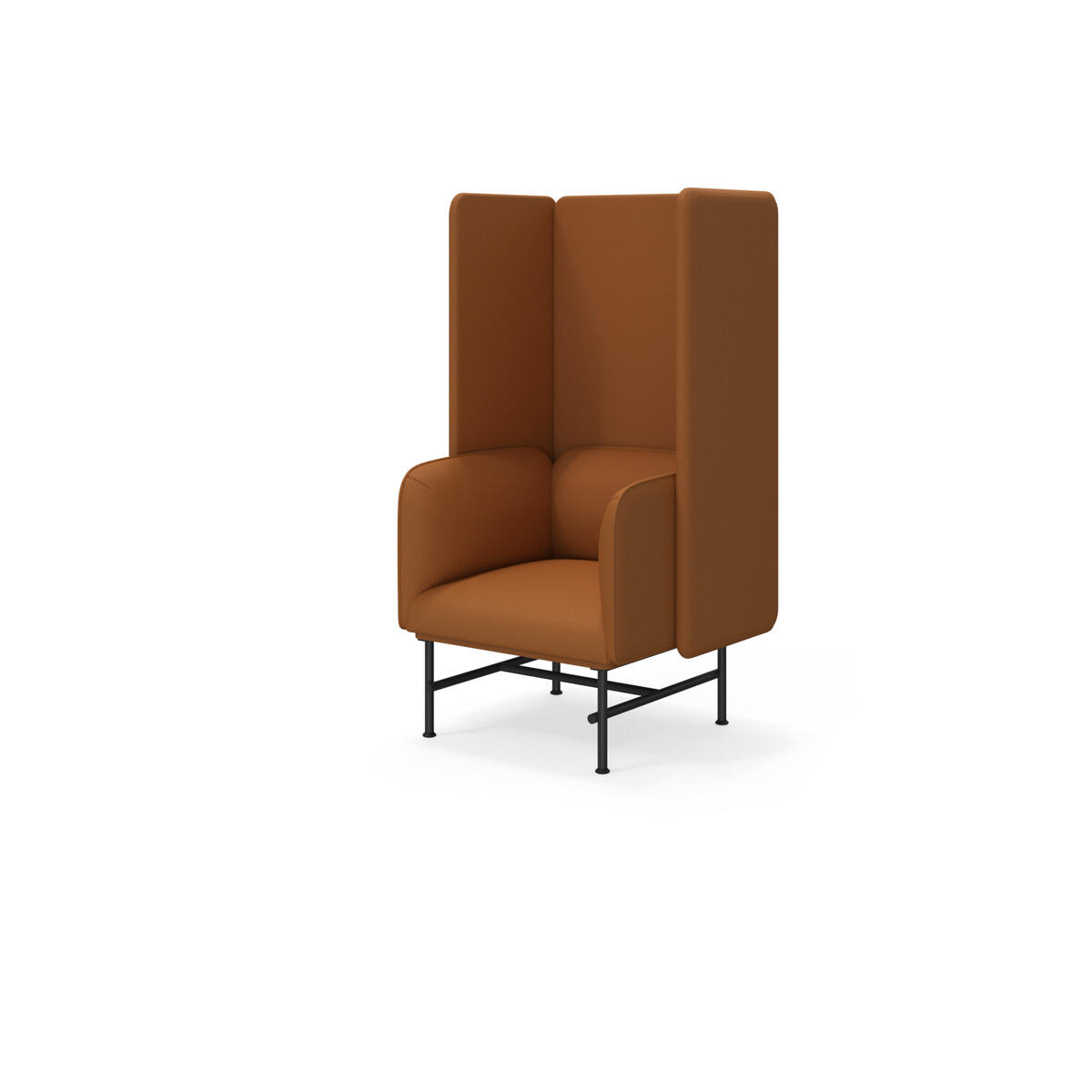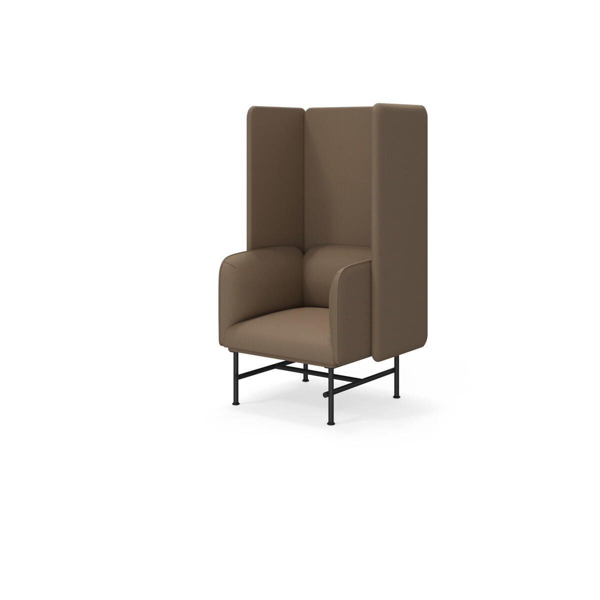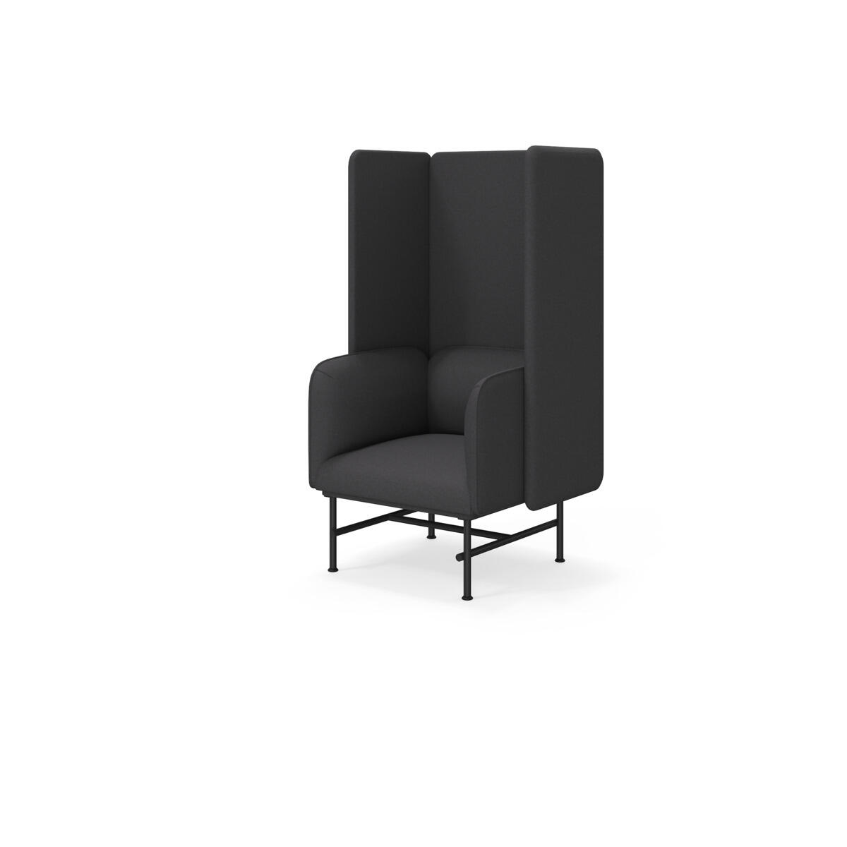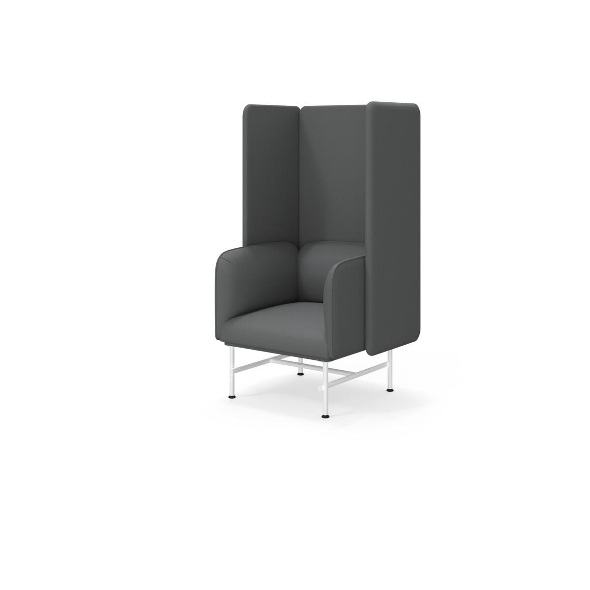 Et minimalistisk møbel, der kombinerer elegance med funktionalitet. Den høje ryg og sider bidrager til at dæmpe lyd og forbedre rummets akustik. Træstel og polstring i koldskum. Ben i pulverlakeret metal. Som tilvalg findes sidebord eller armstøtte i metal, bestilles på eget artikelnummer.