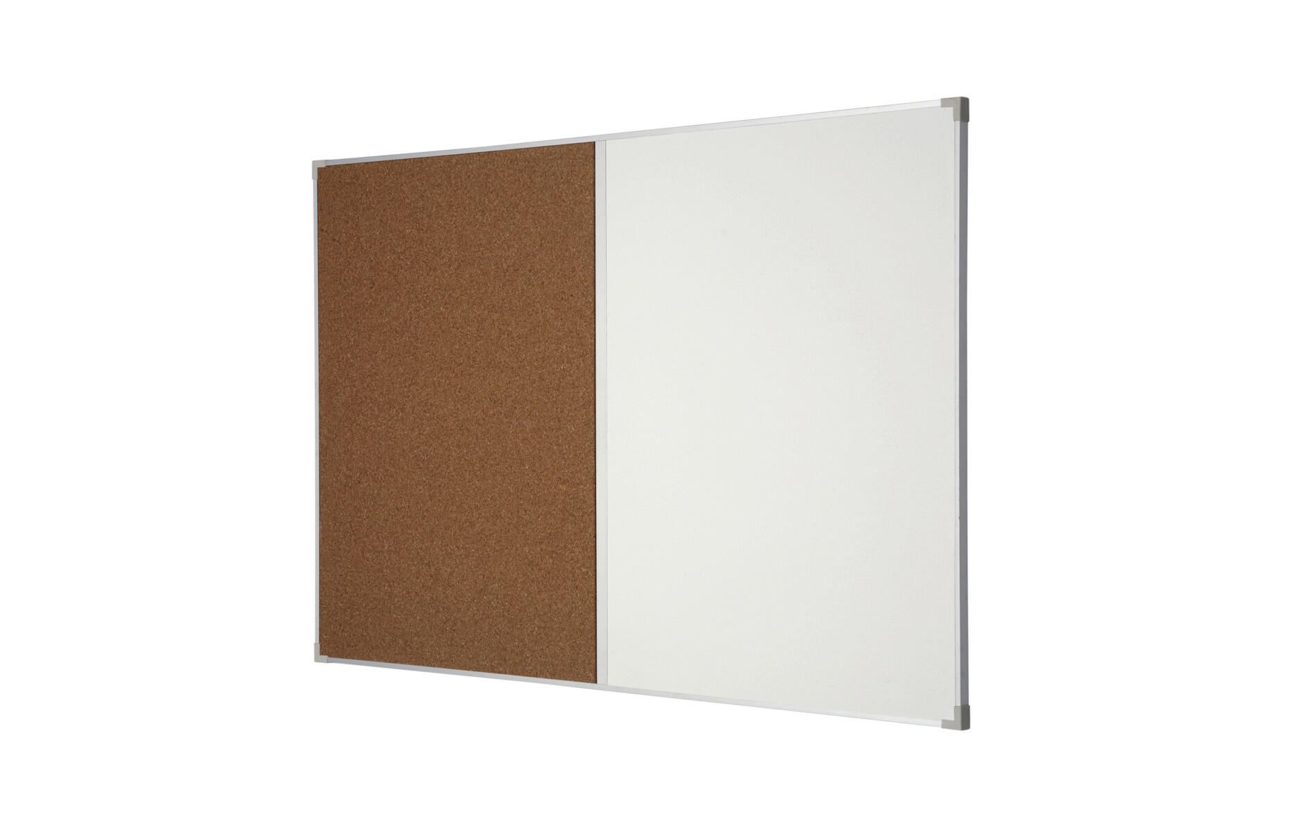 Den ene halvdel af tavlen er whiteboard med magnetfuntion og den anden halvdel er opslagstavle af naturkork. Ramme af aluminium. Tuschholder medfølger.