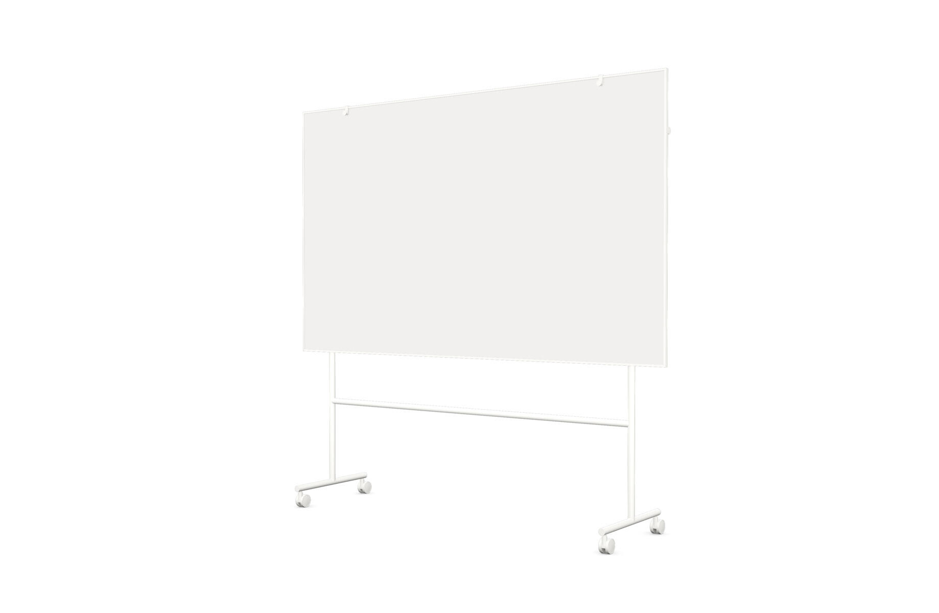 Hvidlakeret stel. Glasemaljeret skriveflade med hvid ramme og hvidlakeret bagside. Udstyret med fire hjul, hvoraf to er låsbare. Tavlens mål: B200 x H120 cm. Stellets base måler ca. 25 cm på hver side af tavlen, hvilket giver den samlede dybde på 50 cm. Totalmål: B200 x D50 x H196 cm.