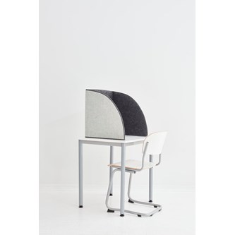 Denne lyddæmpende bordskærm er rigtig god, når der er behov for at trække sig lidt tilbage fra en større gruppe. Det er et rigtig godt hjælpemiddel til alle som behøver hjælp til at fokusere på egne opgaver, da man kan skabe sit eget lille rum i rummet. Skærmene består af 3 dele som nemt vinkles ud fra eget behov. Efter brug kan skærmen hænges på væggen og fungerer da som absorbent i rummet. Grå kantliste. Mål: 50x50x50 cm. Materiale: Syntetisk filt af mindst 50 % genbrugsmateriale. 100 % genanvendelig. Stof: 100 % uld.