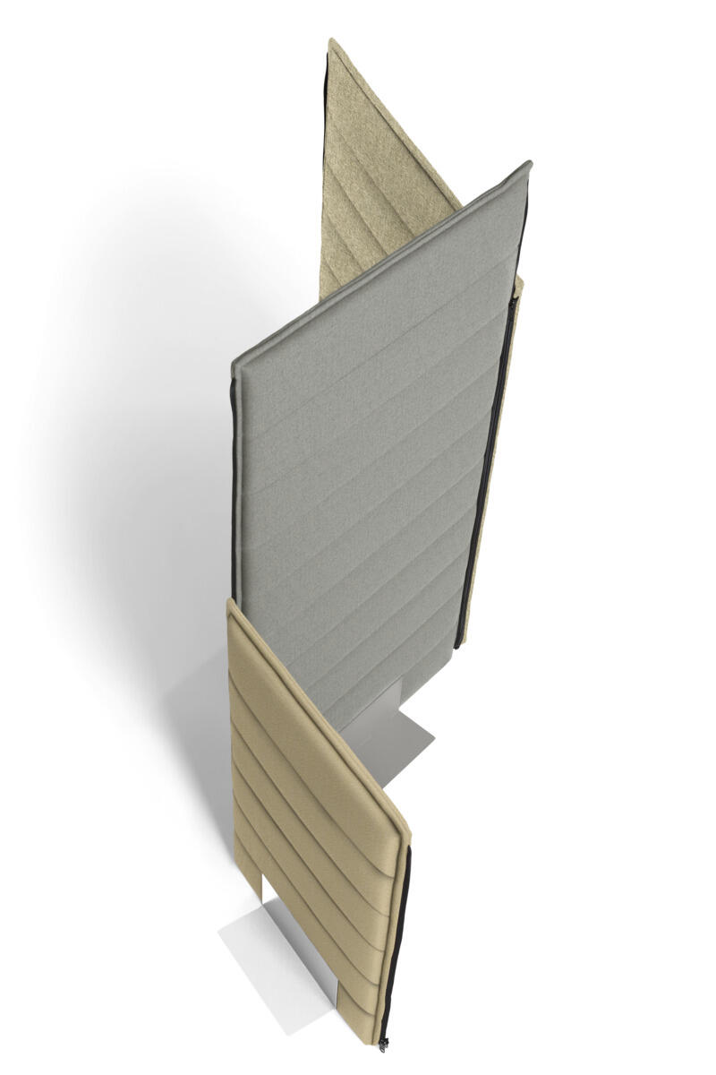 Skærm med lynlåsfunktion, der nemt samles og vinkles for fleksibel afskærmning og effektiv lydabsorbering. Lav, flad metalfod giver et let og stabilt udtryk.