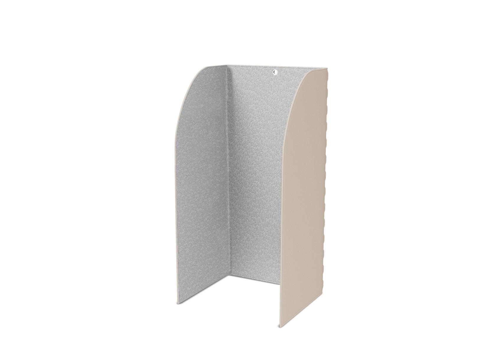 Lyddæmpende gulvskærm bestående af tre dele der kan vinkles efter behov. Efter brug kan skærmen hænges på væggen og fungerer derefter som en lydabsorbent. Passer til et bord med dimensionerne 70x60 cm. Materiale: Syntetisk filt af mindst 50 % genanvendt materiale. 100 % genanvendeligt. Lysegrå inderside, vælg farve på ydersiden af skærmen.