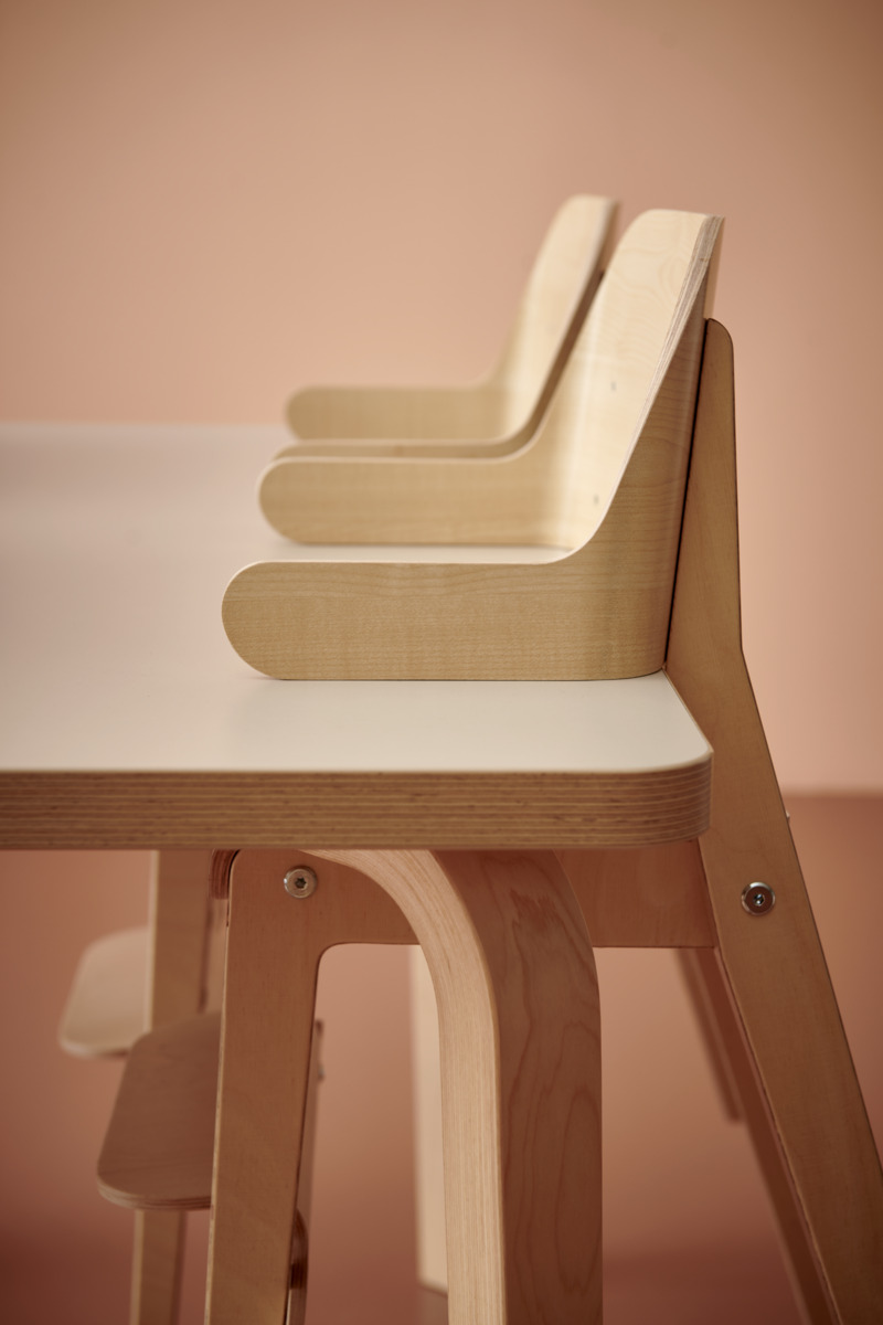 Grow har et cirkulært design med udskiftelige dele, hvilket sikrer en lang levetid. Stel i klarlakeret birkefiner, og både sæde og ryg er lavet af krydsfiner med holdbart højtrykslaminat. Ryglænet med armlæn er ergonomisk formet for optimal komfort og støtte. Det let bagudlænede sæde med afrundet forkant giver en behagelig siddeoplevelse og forhindrer, at barnet glider ned. Sædets overflade er uden skruehuller, hvilket gør det nemt at rengøre. Stolens sædedybde og siddehøjde er tilpasset børn på 95-115 cm. Stolen kan stables op til tre i højden og opfylder de høje krav i henhold til standard EN 17191.