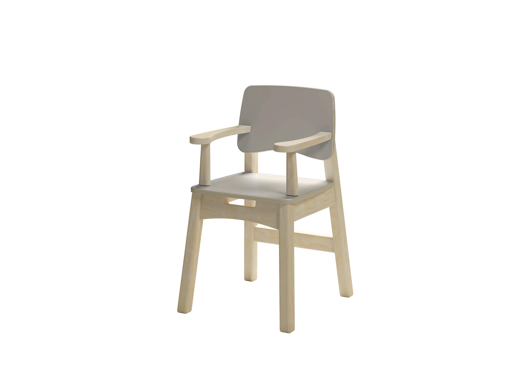 Farvekoordineret med vores øvrige sortiment. Stel i hvidpigmenteret birk. Sæde og ryg i højtrykslaminat. Med støjdæmpende glidefødder. Sæde: B34 D28 cm, siddehøjde 20 cm. Mål fra gulv til armlæn er 31 cm.