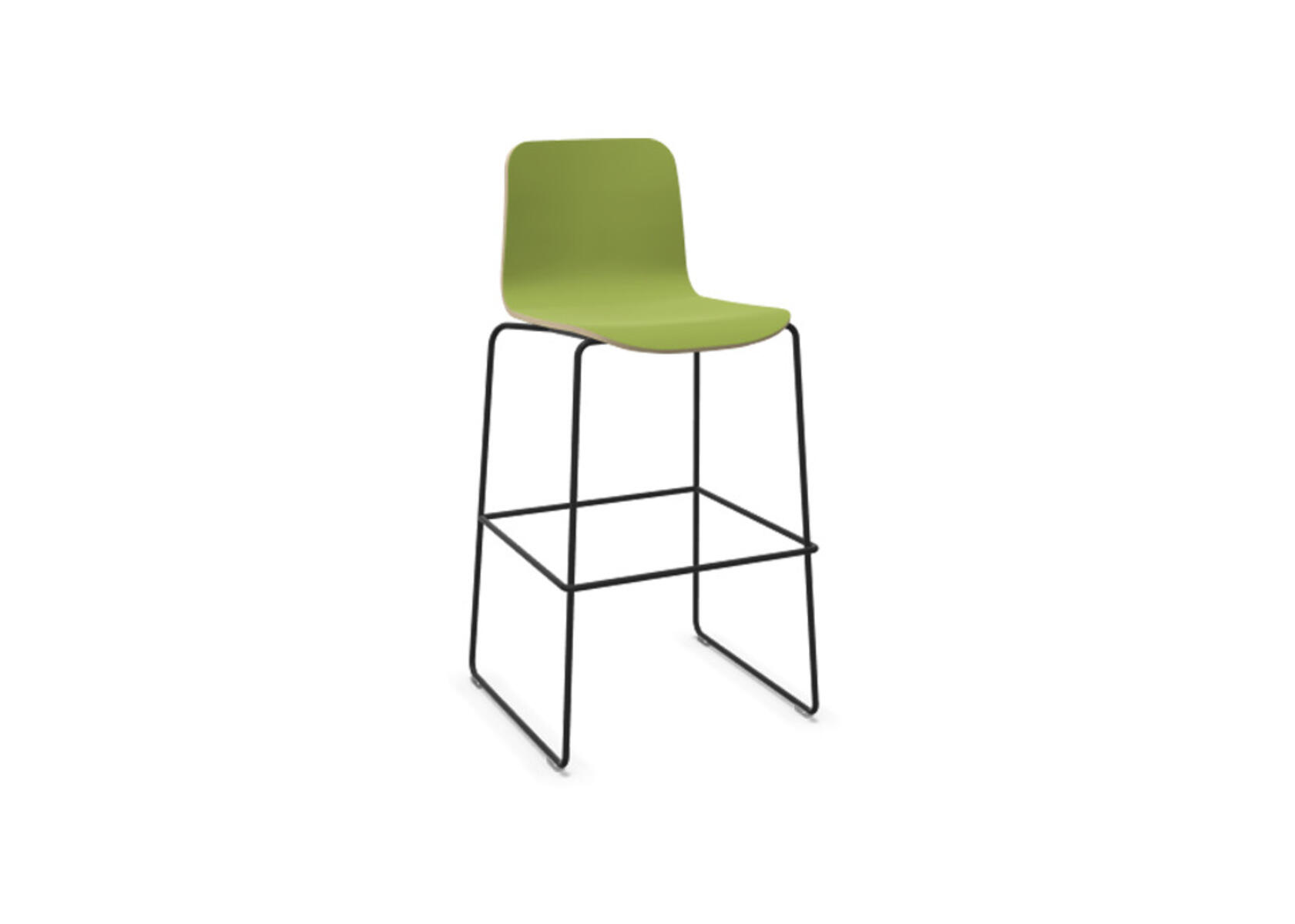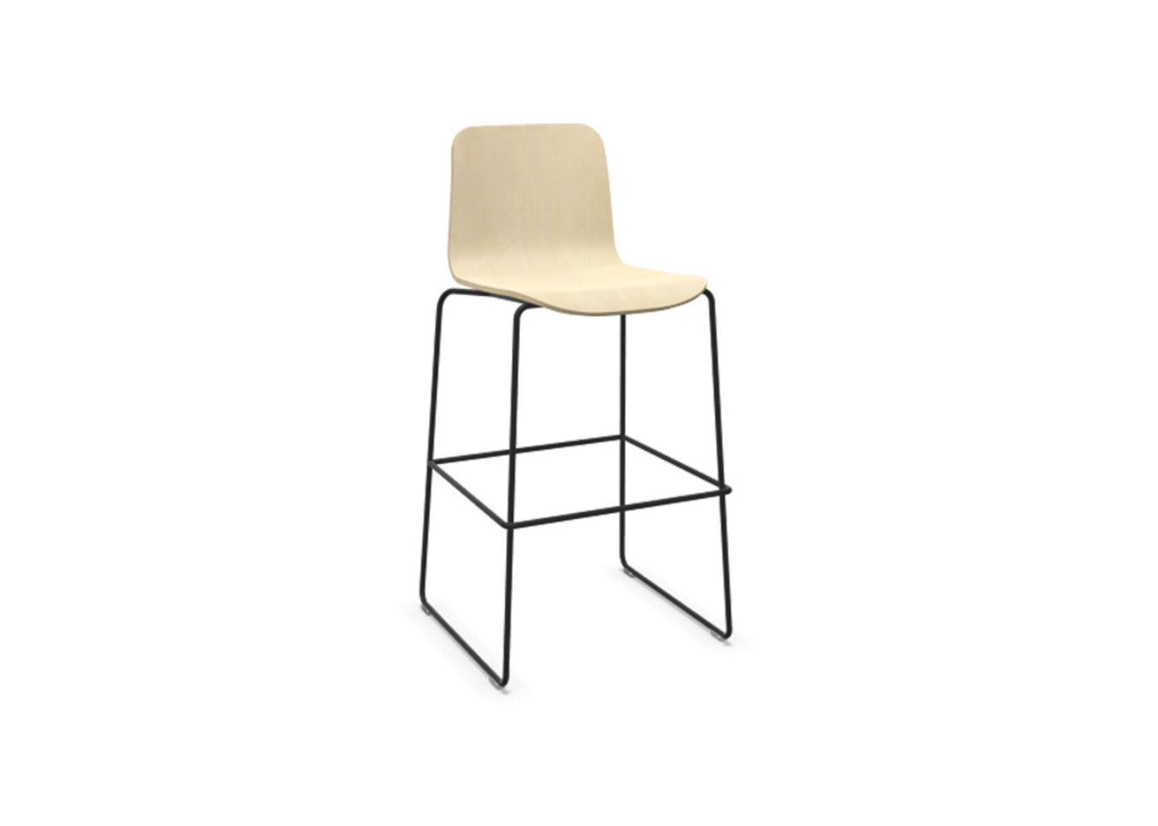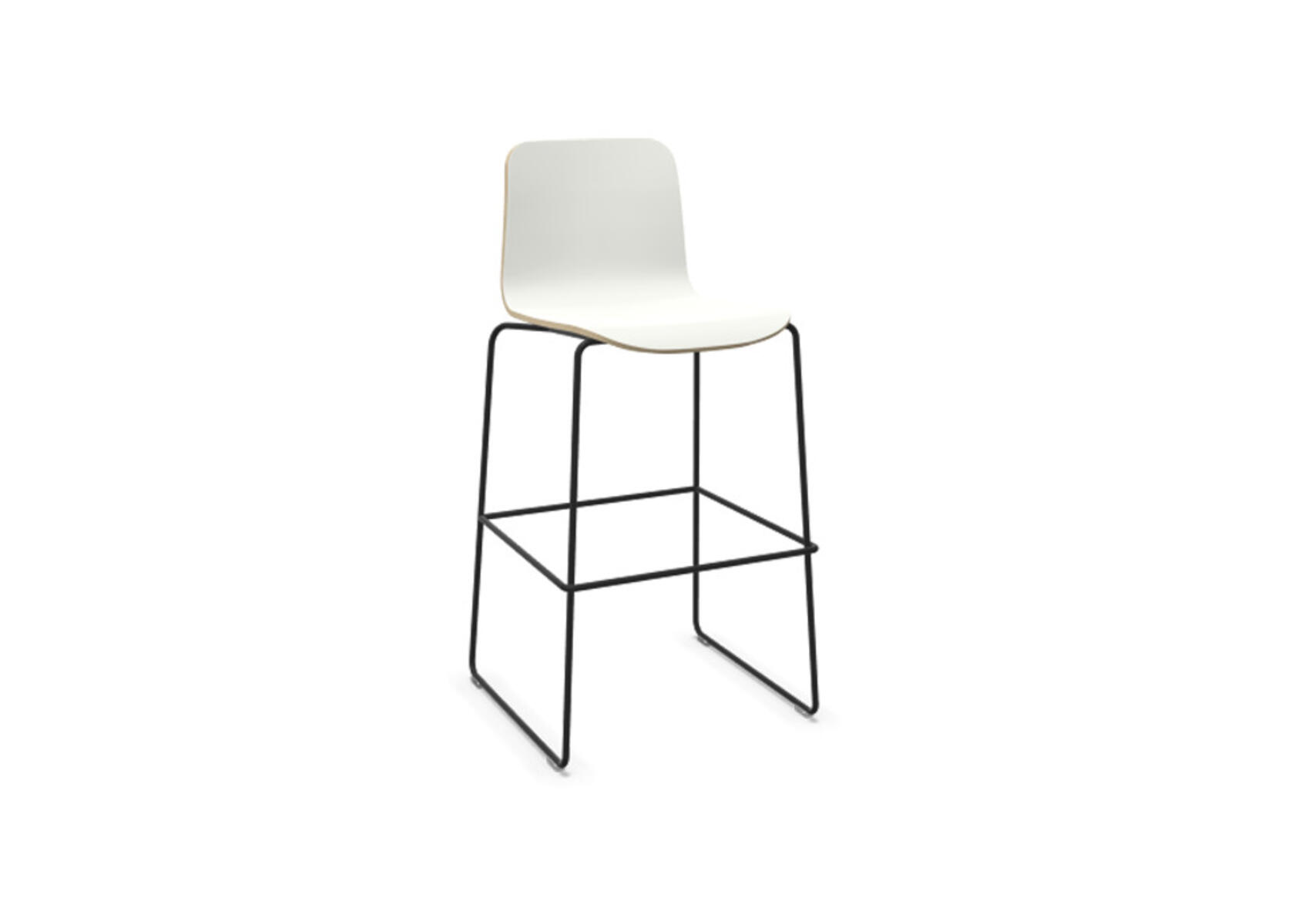 Sædeskål i formpresset krydsfinér belagt med højtrykslaminat. Stabilt pulverlakeret stel i Ø12 mm rør med møbelglidere, der beskytter gulvet. Fodstøtte placeret 34 cm over gulvet. Maks. belastning 110 kg. Stolen er ikke stabelbar.