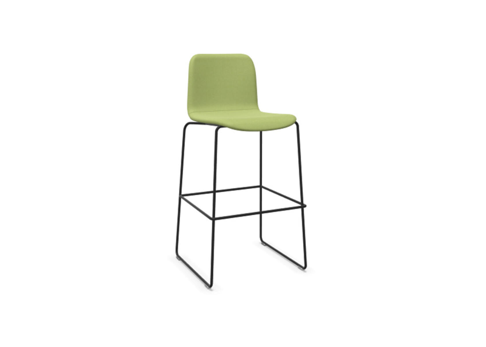 Sædeskål i formpresset krydsfinér belagt med højtrykslaminat. Stabilt pulverlakeret stel i Ø18 mm rør med møbelglidere, der beskytter gulvet. Fodstøtte placeret 34 cm over gulvet. Maks. belastning 110 kg. Stolen er ikke stabelbar.