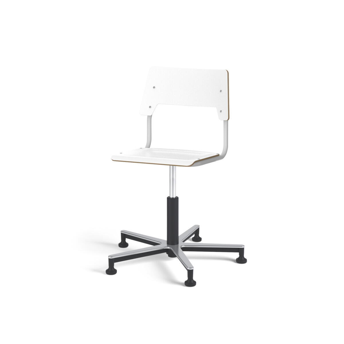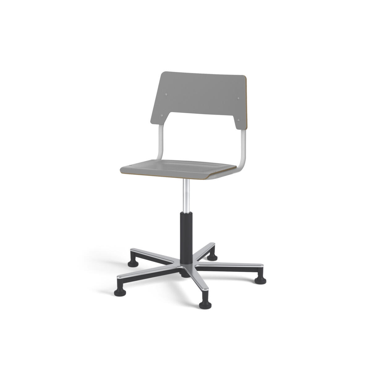 Sæde og ryg er fremstillet af krydsfinér med overflade i højtrykslaminat. Sædet er formet, hvilket giver god siddekomfort. Ramme til sæde og ryg er lakeret sort, RAL 9006. Udstyret med gasdæmper til regulering af sædehøjde via greb. shAluminiumskryds med glidefødder. En afstand mellem ryg og stel muliggør ophængning af stolen på bordkanten via ryggen. For at undgå skader på bordet ved ophængning er der monteret glidebeskyttelse på ryggen. Afstanden gør det desuden muligt at anvende stellet som en praktisk taskekrog.