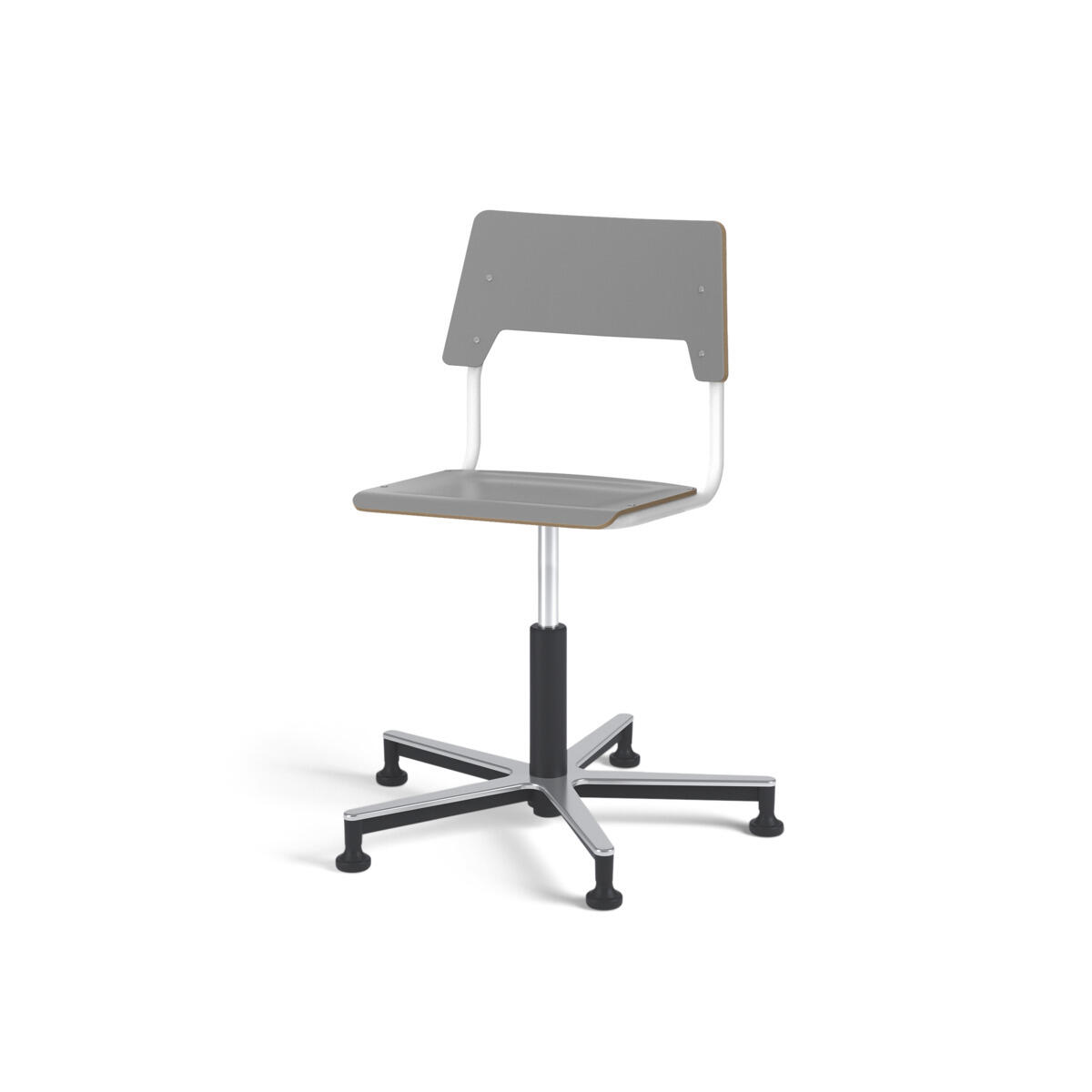 Sæde og ryg er fremstillet af krydsfinér med overflade i højtrykslaminat. Sædet er formet, hvilket giver god siddekomfort. Ramme til sæde og ryg er lakeret sort, RAL 9006. Udstyret med gasdæmper til regulering af sædehøjde via greb. shAluminiumskryds med glidefødder. En afstand mellem ryg og stel muliggør ophængning af stolen på bordkanten via ryggen. For at undgå skader på bordet ved ophængning er der monteret glidebeskyttelse på ryggen. Afstanden gør det desuden muligt at anvende stellet som en praktisk taskekrog.