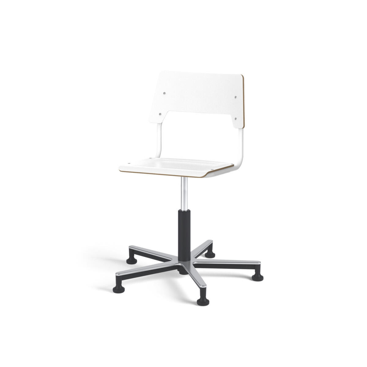 Sæde og ryg er fremstillet af krydsfinér med overflade i højtrykslaminat. Sædet er formet, hvilket giver god siddekomfort. Ramme til sæde og ryg er lakeret sort, RAL 9003. Udstyret med gasdæmper til regulering af sædehøjde via greb. Aluminiumskryds med glidefødder. En afstand mellem ryg og stel muliggør ophængning af stolen på bordkanten via ryggen. For at undgå skader på bordet ved ophængning er der monteret glidebeskyttelse på ryggen. Afstanden gør det desuden muligt at anvende stellet som en praktisk taskekrog.