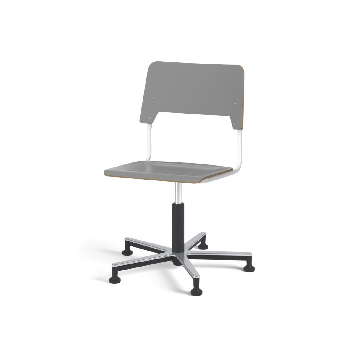 Sæde og ryg er fremstillet af krydsfinér med overflade i højtrykslaminat. Sædet er formet, hvilket giver god siddekomfort. Ramme til sæde og ryg er lakeret sort, RAL 9006. Udstyret med gasdæmper til regulering af sædehøjde via greb. shAluminiumskryds med glidefødder. En afstand mellem ryg og stel muliggør ophængning af stolen på bordkanten via ryggen. For at undgå skader på bordet ved ophængning er der monteret glidebeskyttelse på ryggen. Afstanden gør det desuden muligt at anvende stellet som en praktisk taskekrog.