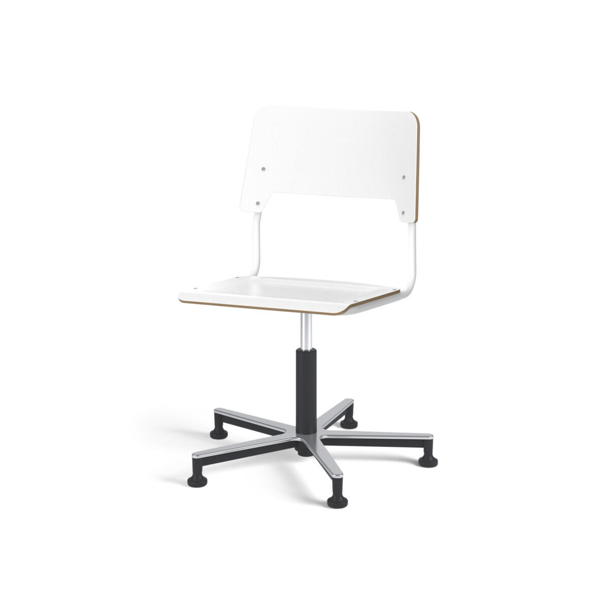 Sæde og ryg er fremstillet af krydsfinér med overflade i højtrykslaminat. Sædet er formet, hvilket giver god siddekomfort. Ramme til sæde og ryg er lakeret sort, RAL 9003. Udstyret med gasdæmper til regulering af sædehøjde via greb. Aluminiumskryds med glidefødder. En afstand mellem ryg og stel muliggør ophængning af stolen på bordkanten via ryggen. For at undgå skader på bordet ved ophængning er der monteret glidebeskyttelse på ryggen. Afstanden gør det desuden muligt at anvende stellet som en praktisk taskekrog.