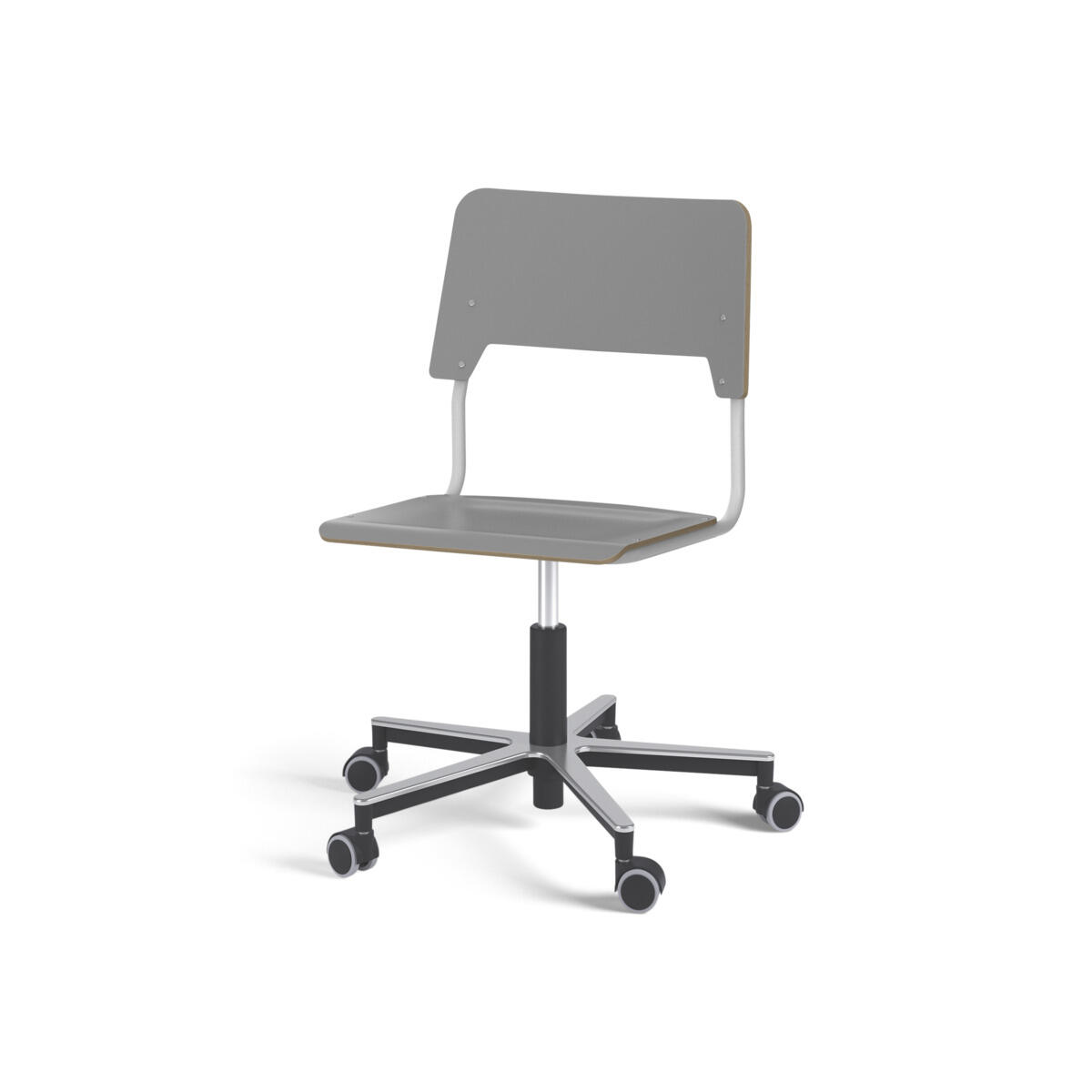 Sæde og ryg er fremstillet af krydsfinér med overflade i højtrykslaminat. Sædet er formet, hvilket giver god siddekomfort. Ramme til sæde og ryg er lakeret sort, RAL 9006. Udstyret med gasdæmper til regulering af sædehøjde via greb. Aluminiumskryds med hjul. En afstand mellem ryg og stel muliggør ophængning af stolen på bordkanten via ryggen. For at undgå skader på bordet ved ophængning er der monteret glidebeskyttelse på ryggen. Afstanden gør det desuden muligt at anvende stellet som en praktisk taskekrog.