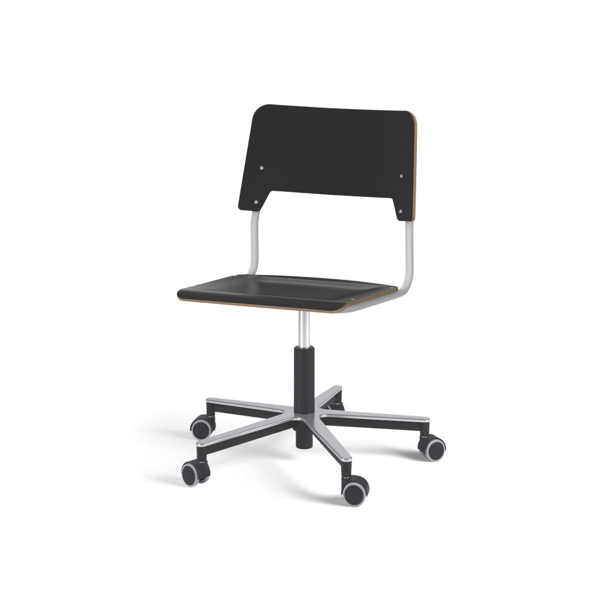 Sæde og ryg er fremstillet af krydsfinér med overflade i højtrykslaminat. Sædet er formet, hvilket giver god siddekomfort. Ramme til sæde og ryg er lakeret sort, RAL 9005. Udstyret med gasdæmper til regulering af sædehøjde via greb. Aluminiumskryds med hjul. En afstand mellem ryg og stel muliggør ophængning af stolen på bordkanten via ryggen. For at undgå skader på bordet ved ophængning er der monteret glidebeskyttelse på ryggen. Afstanden gør det desuden muligt at anvende stellet som en praktisk taskekrog.