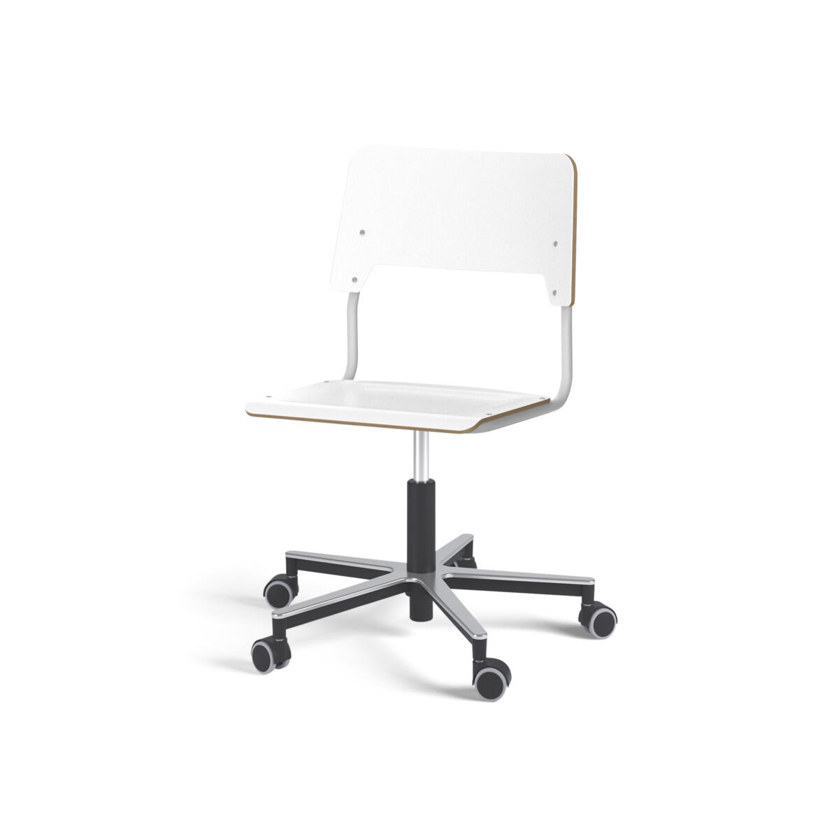 Sæde og ryg er fremstillet af krydsfinér med overflade i højtrykslaminat. Sædet er formet, hvilket giver god siddekomfort. Ramme til sæde og ryg er lakeret sort, RAL 9003. Udstyret med gasdæmper til regulering af sædehøjde via greb. Aluminiumskryds med hjul. En afstand mellem ryg og stel muliggør ophængning af stolen på bordkanten via ryggen. For at undgå skader på bordet ved ophængning er der monteret glidebeskyttelse på ryggen. Afstanden gør det desuden muligt at anvende stellet som en praktisk taskekrog.