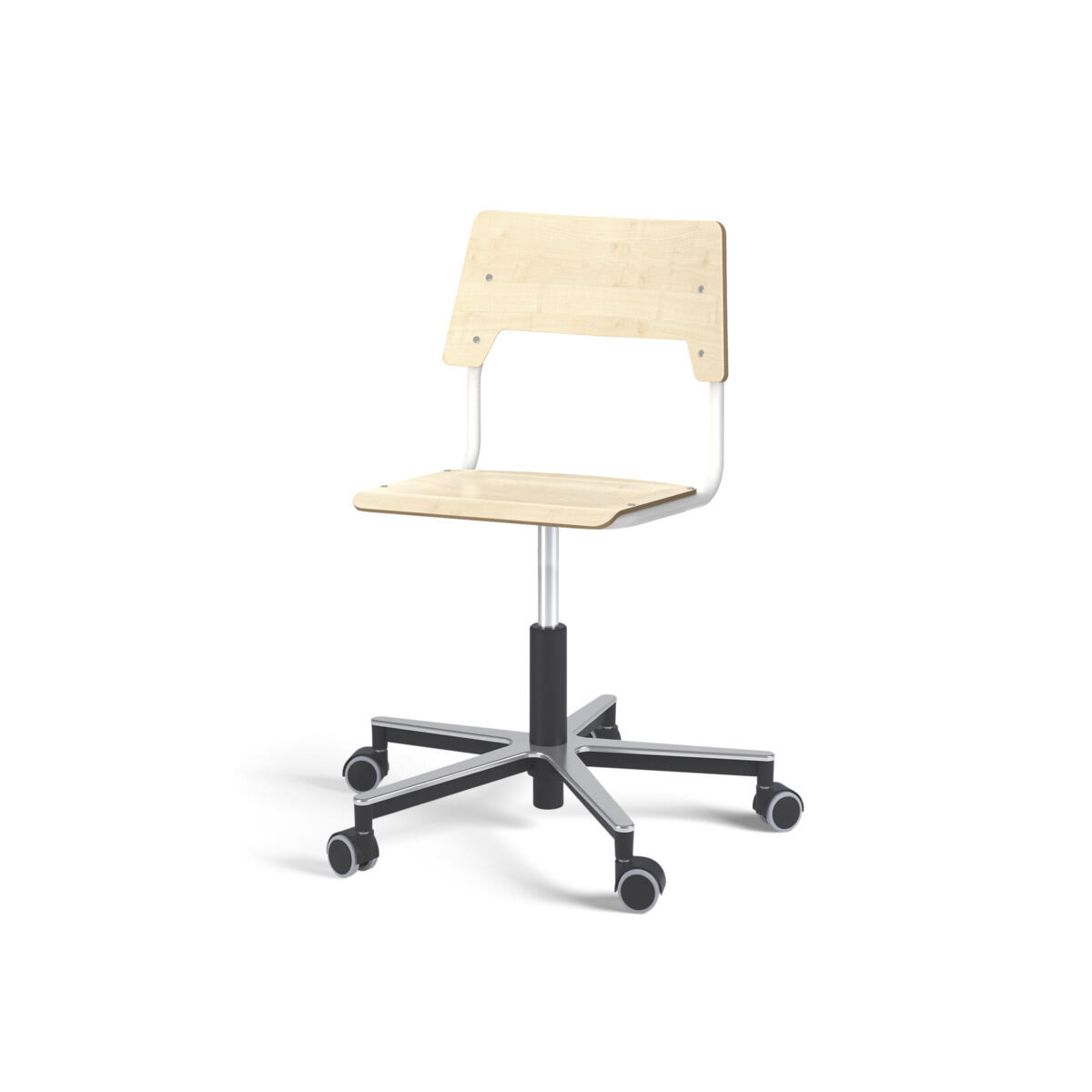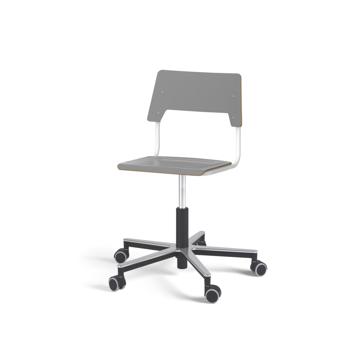 Sæde og ryg er fremstillet af krydsfinér med overflade i højtrykslaminat. Sædet er formet, hvilket giver god siddekomfort. Ramme til sæde og ryg er lakeret sort, RAL 9006. Udstyret med gasdæmper til regulering af sædehøjde via greb. Aluminiumskryds med hjul. En afstand mellem ryg og stel muliggør ophængning af stolen på bordkanten via ryggen. For at undgå skader på bordet ved ophængning er der monteret glidebeskyttelse på ryggen. Afstanden gør det desuden muligt at anvende stellet som en praktisk taskekrog.