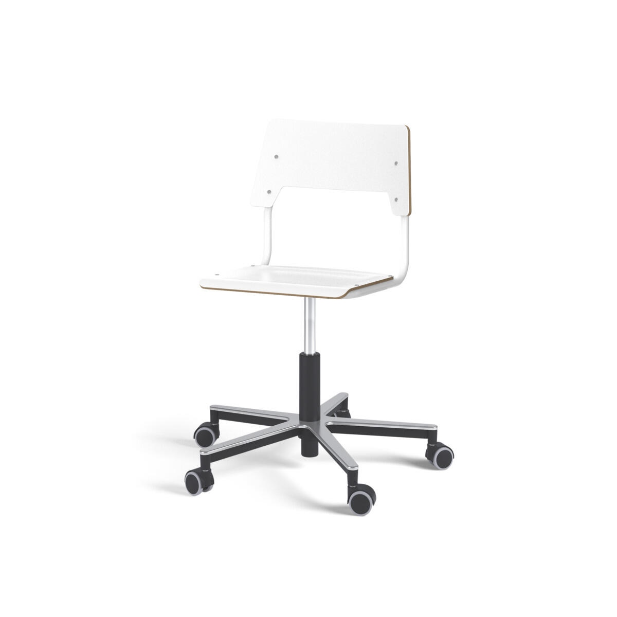 Sæde og ryg er fremstillet af krydsfinér med overflade i højtrykslaminat. Sædet er formet, hvilket giver god siddekomfort. Ramme til sæde og ryg er lakeret sort, RAL 9003. Udstyret med gasdæmper til regulering af sædehøjde via greb. Aluminiumskryds med hjul. En afstand mellem ryg og stel muliggør ophængning af stolen på bordkanten via ryggen. For at undgå skader på bordet ved ophængning er der monteret glidebeskyttelse på ryggen. Afstanden gør det desuden muligt at anvende stellet som en praktisk taskekrog.