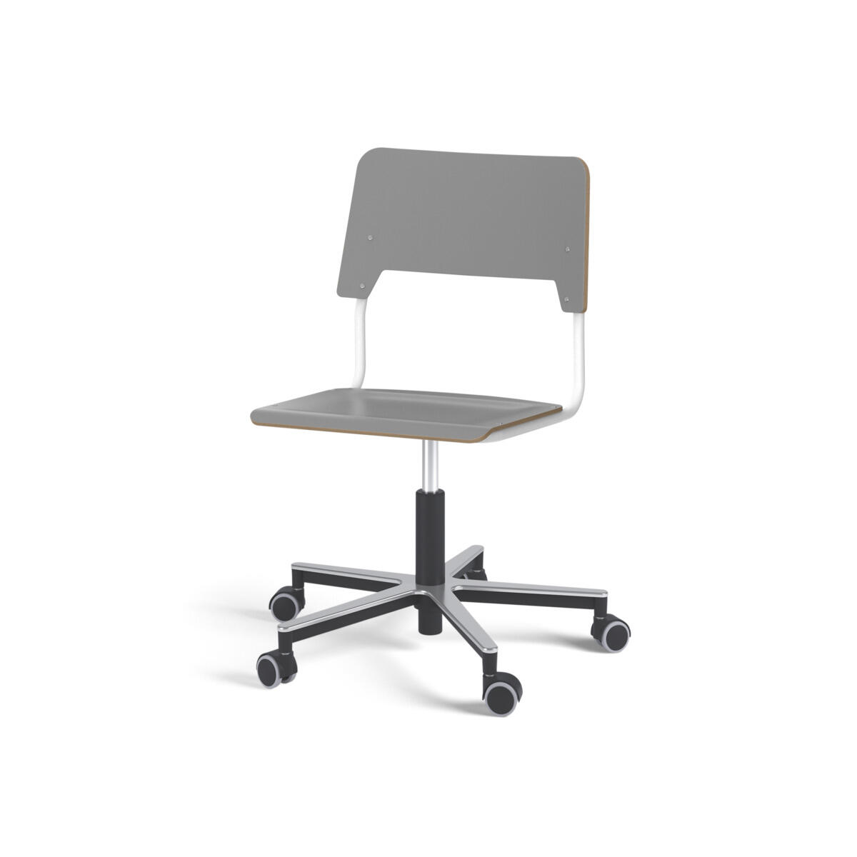 Sæde og ryg er fremstillet af krydsfinér med overflade i højtrykslaminat. Sædet er formet, hvilket giver god siddekomfort. Ramme til sæde og ryg er lakeret sort, RAL 9006. Udstyret med gasdæmper til regulering af sædehøjde via greb. Aluminiumskryds med hjul. En afstand mellem ryg og stel muliggør ophængning af stolen på bordkanten via ryggen. For at undgå skader på bordet ved ophængning er der monteret glidebeskyttelse på ryggen. Afstanden gør det desuden muligt at anvende stellet som en praktisk taskekrog.