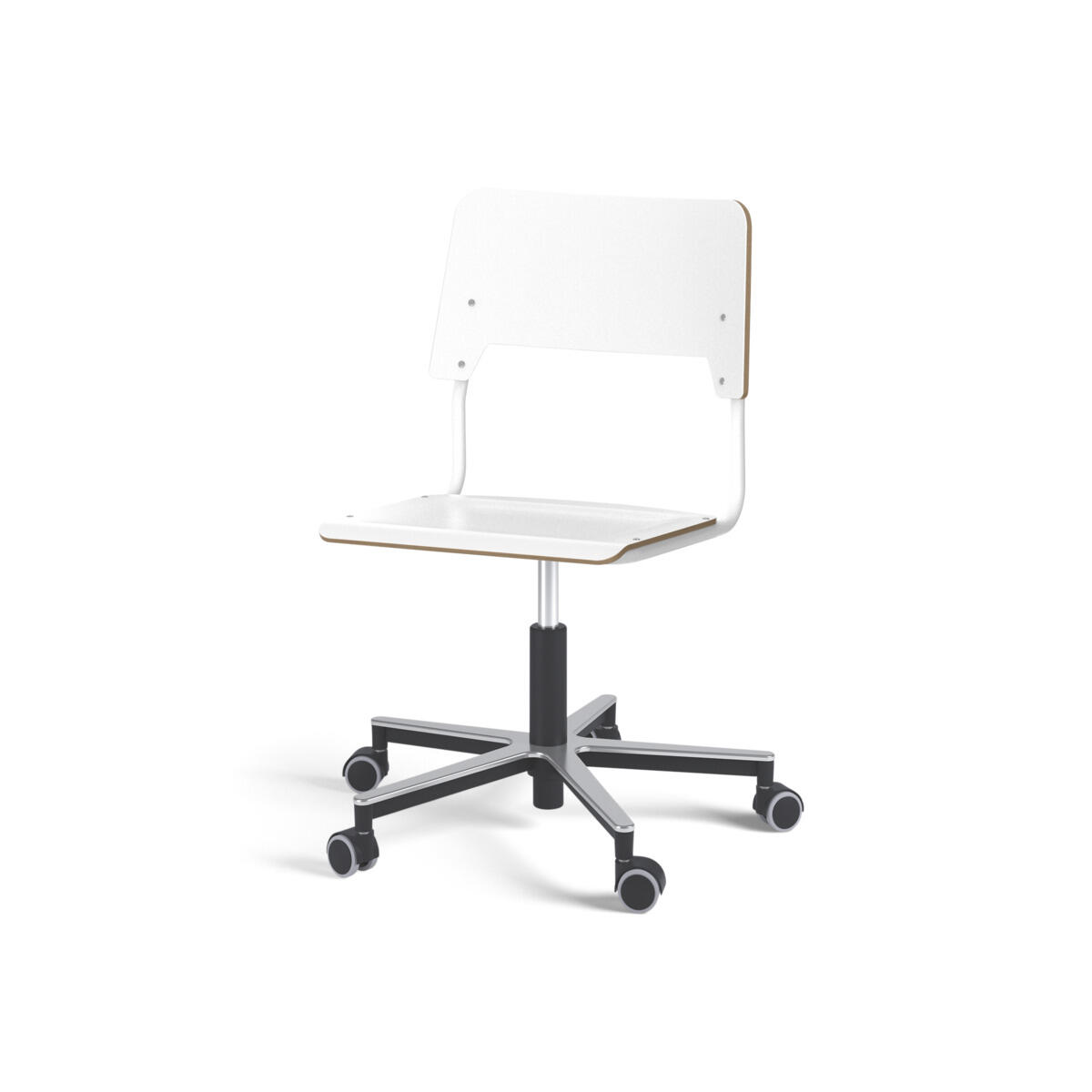 Sæde og ryg er fremstillet af krydsfinér med overflade i højtrykslaminat. Sædet er formet, hvilket giver god siddekomfort. Ramme til sæde og ryg er lakeret sort, RAL 9003. Udstyret med gasdæmper til regulering af sædehøjde via greb. Aluminiumskryds med hjul. En afstand mellem ryg og stel muliggør ophængning af stolen på bordkanten via ryggen. For at undgå skader på bordet ved ophængning er der monteret glidebeskyttelse på ryggen. Afstanden gør det desuden muligt at anvende stellet som en praktisk taskekrog.