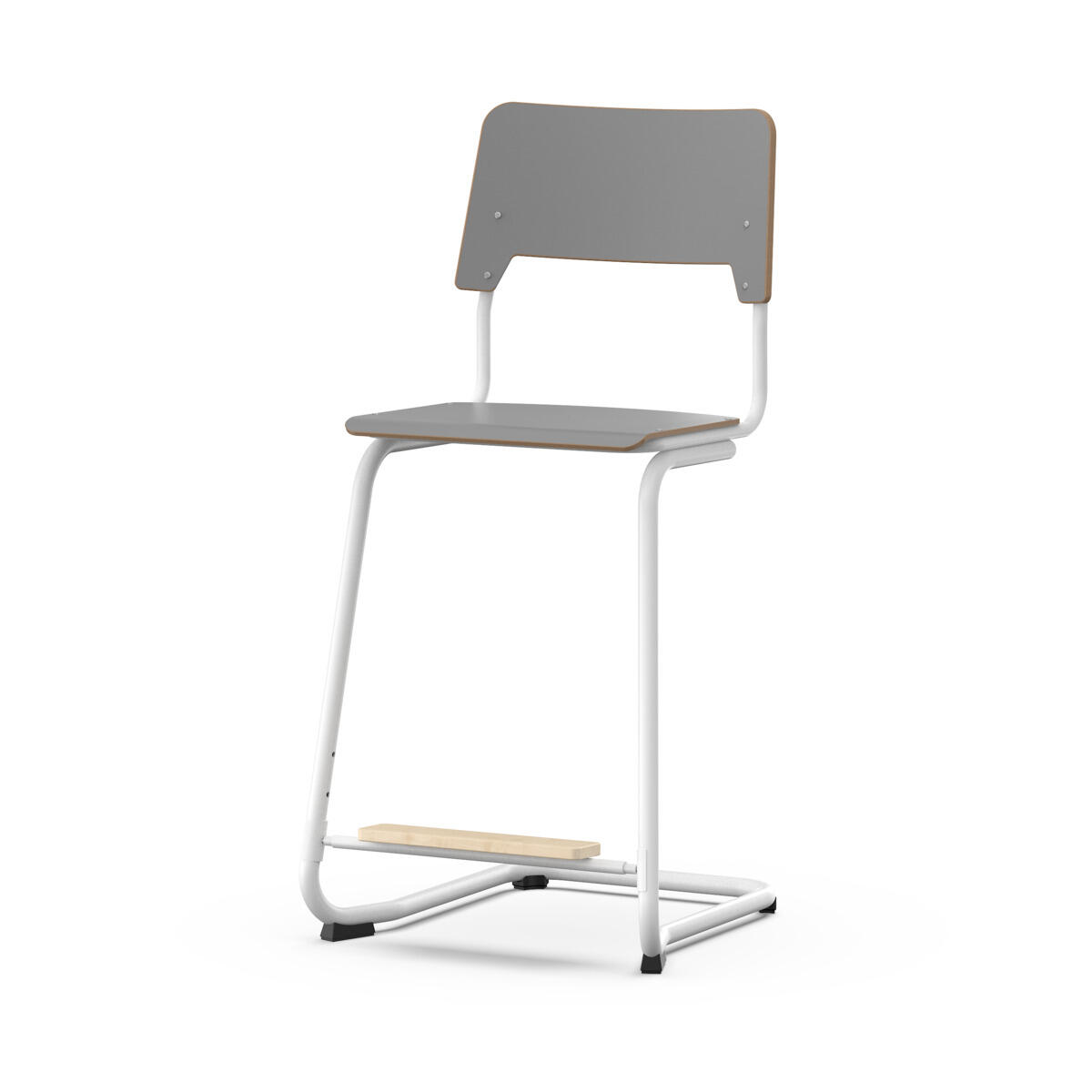 Sæde og ryg er fremstillet af krydsfiner med en overflade af højtrykslaminat. Sædet er formet, hvilket gør det behageligt at sidde på. Stellet er lakeret i sølv, RAL 9006. Fødderne har filt. Stolen opfylder kravene i henhold til EN 1729-1 & 2. En afstand mellem ryggen og stativ muliggør ophængning af stolen ved hjælp af ryggen. For at forhindre skader på bordet under ophængning er der monteret glidebeskyttere på ryggen. Afstanden gør det også muligt at bruge stativet som en praktisk taskeskrog. Justerbart fodstøtte i tre faste positioner (26, 31 og 36 cm fra sædet).