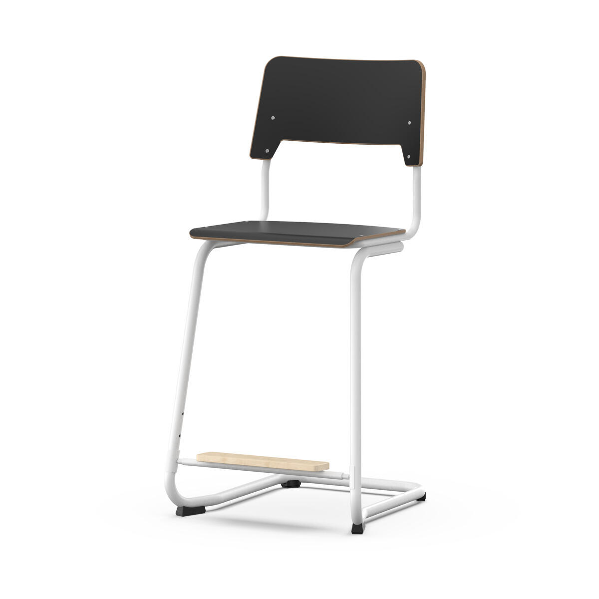 Sæde og ryg er fremstillet af krydsfinér med overflade i højtrykslaminat. Sædet er formet, hvilket giver god siddekomfort. Stellet er lakeret sort, RAL 9006. Justerbart fodstøtte i tre faste positioner. Fødder med filtdupper. Stolen opfylder kravene i henhold til EN 1729-2. Stabelbar. En afstand mellem ryg og stel muliggør ophængning af stolen på bordkanten via ryggen. For at undgå skader på bordet ved ophængning er der monteret glidebeskyttelse på ryggen. Afstanden gør det desuden muligt at anvende stellet som en praktisk taskekrog.