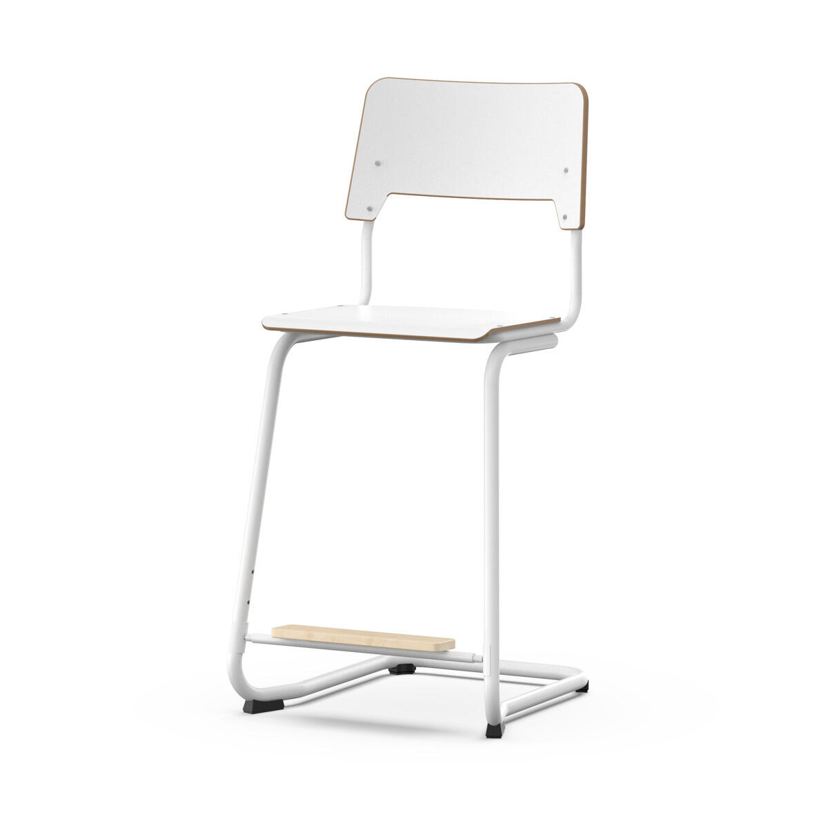 Sædet og ryggen er fremstillet af krydsfiner med en overflade af højtrykslaminat. Sædet er formet, hvilket gør det behageligt at sidde på. Stellet er lakeret i hvidt, RAL 9003. Fødderne har filt. Stolen opfylder kravene i henhold til EN 1729-1 & 2. En afstand mellem ryggen og stativ muliggør ophængning af stolen ved hjælp af ryggen. For at forhindre skader på bordet under ophængning er der monteret glidebeskyttere på ryggen. Afstanden gør det også muligt at bruge stativet som en praktisk taskeskrog. Justerbart fodstøtte i tre faste positioner (26, 31 og 36 cm fra sædet).