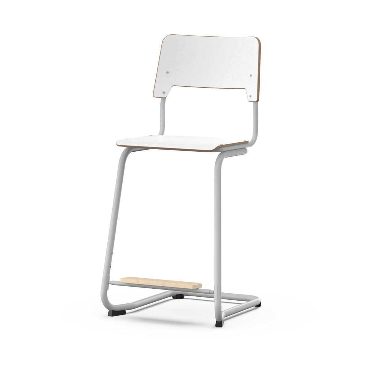 Sædet og ryggen er fremstillet af krydsfiner med en overflade af højtrykslaminat. Sædet er formet, hvilket gør det behageligt at sidde på. Stellet er lakeret i hvidt, RAL 9003. Fødderne har filt. Stolen opfylder kravene i henhold til EN 1729-1 & 2. En afstand mellem ryggen og stativ muliggør ophængning af stolen ved hjælp af ryggen. For at forhindre skader på bordet under ophængning er der monteret glidebeskyttere på ryggen. Afstanden gør det også muligt at bruge stativet som en praktisk taskeskrog. Justerbart fodstøtte i tre faste positioner (26, 31 og 36 cm fra sædet).
