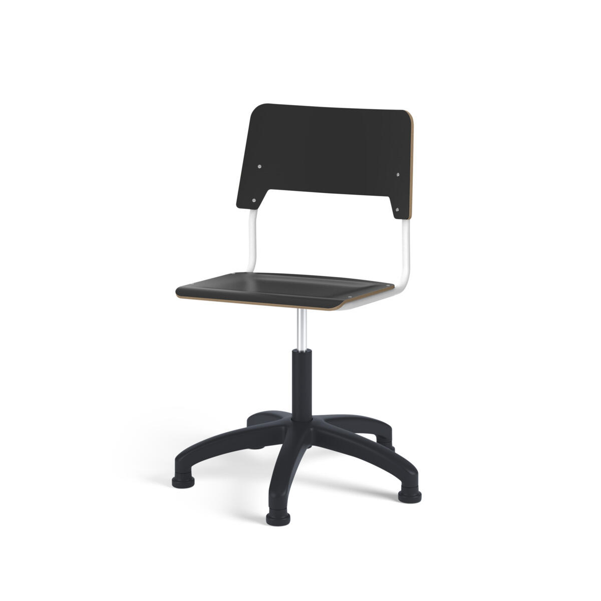 Sæde og ryg er fremstillet af krydsfinér med overflade i højtrykslaminat. Sædet er formet, hvilket giver god siddekomfort. Ramme til sæde og ryg er lakeret sort, RAL 9005. Udstyret med gasdæmper til regulering af sædehøjde via greb. Sort nylonkryds med glidefødder. En afstand mellem ryg og stel muliggør ophængning af stolen på bordkanten via ryggen. For at undgå skader på bordet ved ophængning er der monteret glidebeskyttelse på ryggen. Afstanden gør det desuden muligt at anvende stellet som en praktisk taskekrog.