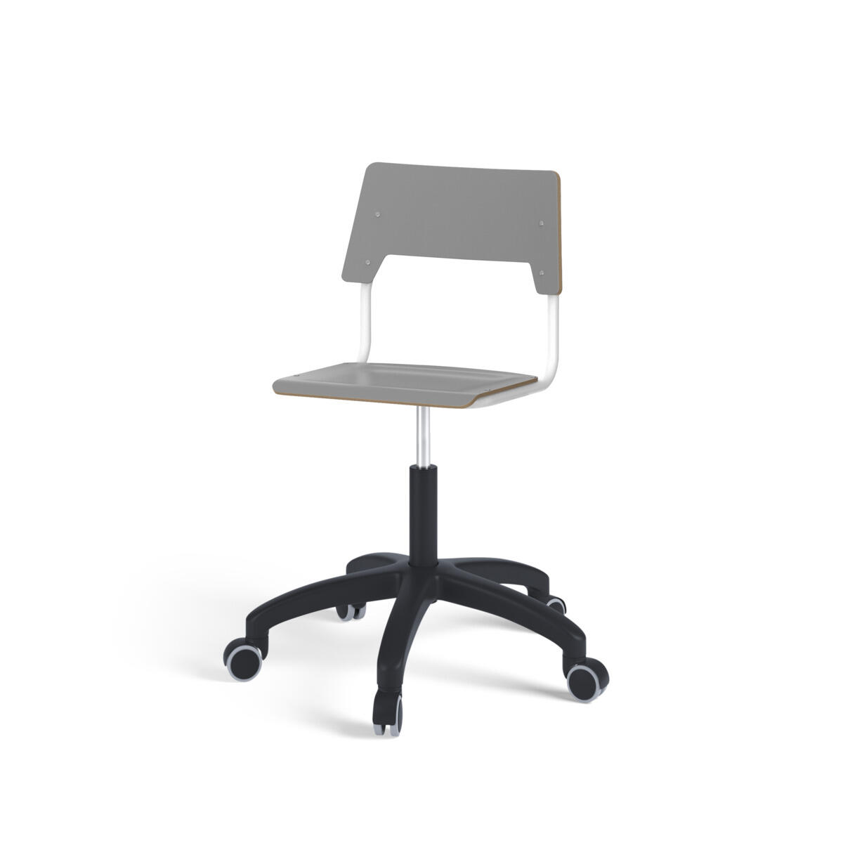 Sæde og ryg er fremstillet af krydsfinér med overflade i højtrykslaminat. Sædet er formet, hvilket giver god siddekomfort. Ramme til sæde og ryg er lakeret sort, RAL 9006. Udstyret med gasdæmper til regulering af sædehøjde via greb. Sort nylonkryds med hjul. En afstand mellem ryg og stel muliggør ophængning af stolen på bordkanten via ryggen. For at undgå skader på bordet ved ophængning er der monteret glidebeskyttelse på ryggen. Afstanden gør det desuden muligt at anvende stellet som en praktisk taskekrog.