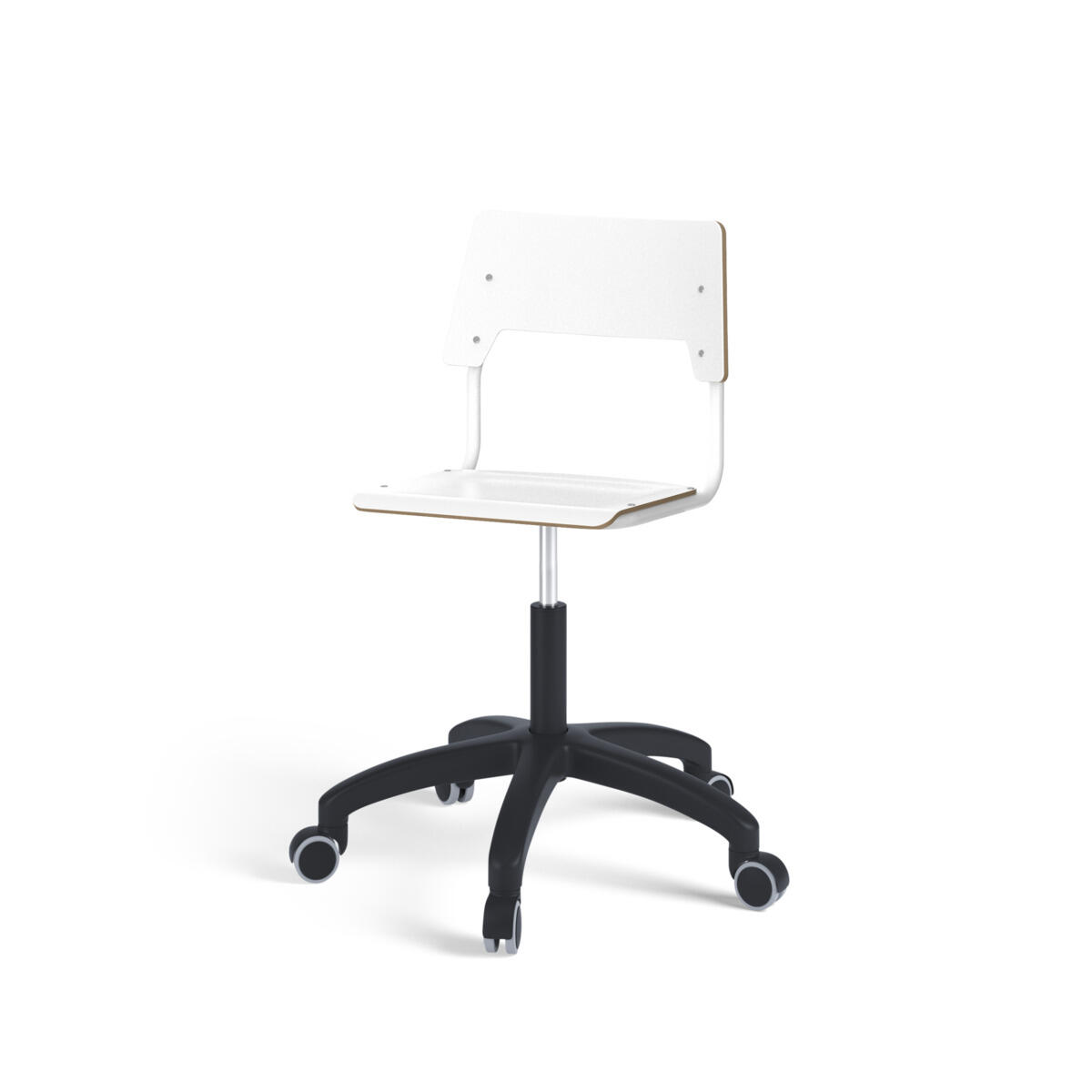 Sæde og ryg er fremstillet af krydsfinér med overflade i højtrykslaminat. Sædet er formet, hvilket giver god siddekomfort. Ramme til sæde og ryg er lakeret sort, RAL 9003. Udstyret med gasdæmper til regulering af sædehøjde via greb. Sort nylonkryds med hjul. En afstand mellem ryg og stel muliggør ophængning af stolen på bordkanten via ryggen. For at undgå skader på bordet ved ophængning er der monteret glidebeskyttelse på ryggen. Afstanden gør det desuden muligt at anvende stellet som en praktisk taskekrog.