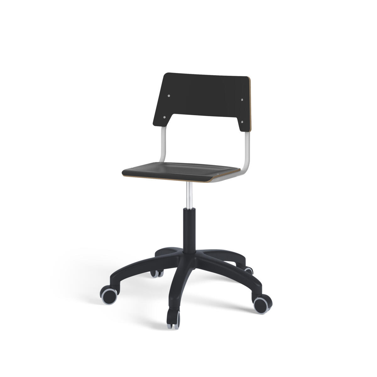 Sæde og ryg er fremstillet af krydsfinér med overflade i højtrykslaminat. Sædet er formet, hvilket giver god siddekomfort. Ramme til sæde og ryg er lakeret sort, RAL 9006. Udstyret med gasdæmper til regulering af sædehøjde via greb. Sort nylonkryds med hjul. En afstand mellem ryg og stel muliggør ophængning af stolen på bordkanten via ryggen. For at undgå skader på bordet ved ophængning er der monteret glidebeskyttelse på ryggen. Afstanden gør det desuden muligt at anvende stellet som en praktisk taskekrog.