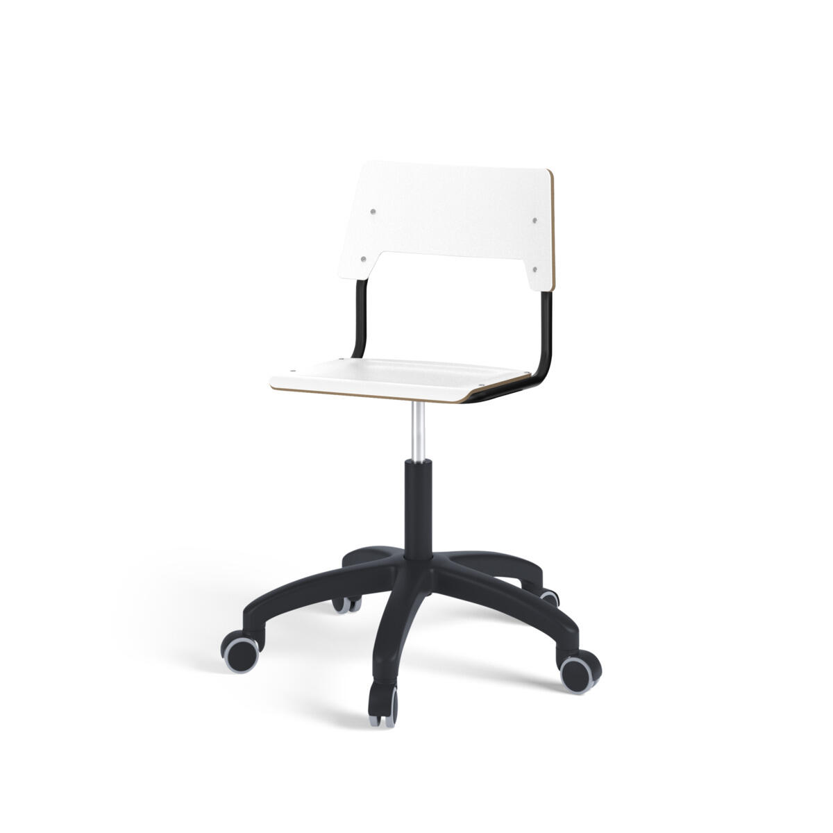 Sæde og ryg er fremstillet af krydsfinér med overflade i højtrykslaminat. Sædet er formet, hvilket giver god siddekomfort. Ramme til sæde og ryg er lakeret sort, RAL 9003. Udstyret med gasdæmper til regulering af sædehøjde via greb. Sort nylonkryds med hjul. En afstand mellem ryg og stel muliggør ophængning af stolen på bordkanten via ryggen. For at undgå skader på bordet ved ophængning er der monteret glidebeskyttelse på ryggen. Afstanden gør det desuden muligt at anvende stellet som en praktisk taskekrog.