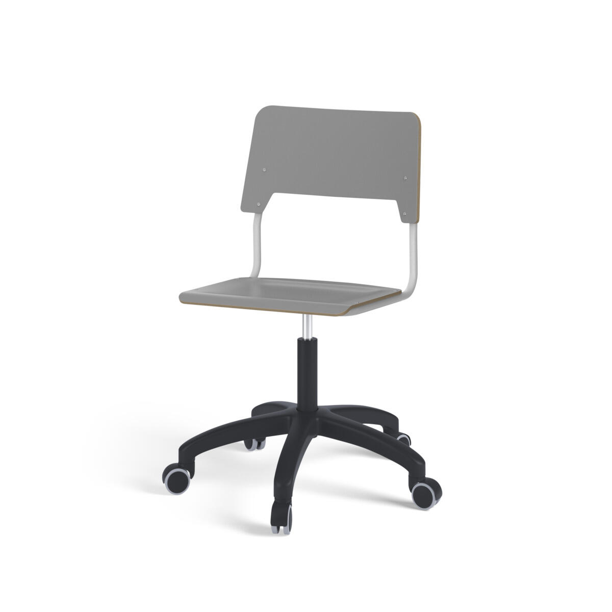 Sæde og ryg er fremstillet af krydsfinér med overflade i højtrykslaminat. Sædet er formet, hvilket giver god siddekomfort. Ramme til sæde og ryg er lakeret sort, RAL 9006. Udstyret med gasdæmper til regulering af sædehøjde via greb. Sort nylonkryds med hjul. En afstand mellem ryg og stel muliggør ophængning af stolen på bordkanten via ryggen. For at undgå skader på bordet ved ophængning er der monteret glidebeskyttelse på ryggen. Afstanden gør det desuden muligt at anvende stellet som en praktisk taskekrog.