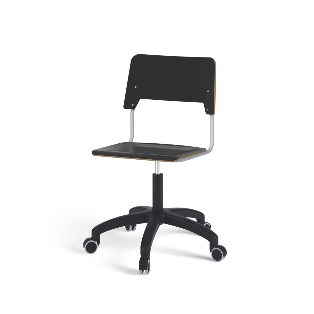 Sæde og ryg er fremstillet af krydsfinér med overflade i højtrykslaminat. Sædet er formet, hvilket giver god siddekomfort. Ramme til sæde og ryg er lakeret sort, RAL 9003. Udstyret med gasdæmper til regulering af sædehøjde via greb. Sort nylonkryds med hjul. En afstand mellem ryg og stel muliggør ophængning af stolen på bordkanten via ryggen. For at undgå skader på bordet ved ophængning er der monteret glidebeskyttelse på ryggen. Afstanden gør det desuden muligt at anvende stellet som en praktisk taskekrog.