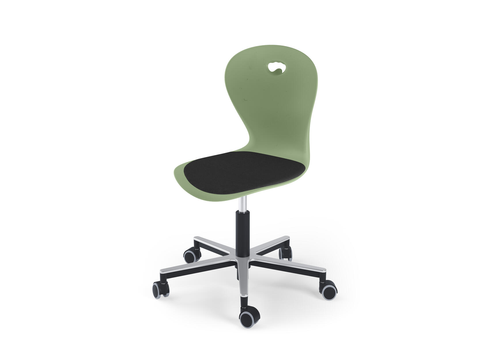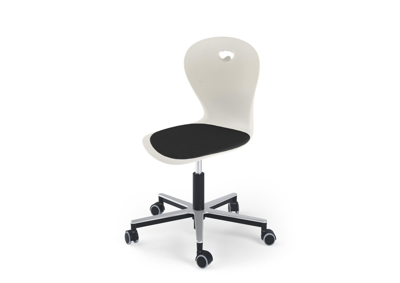 En skolestol med en fleksibel støtte til ryggen. Det ergonomiske design giver brugeren af stolen en bedre kropsholdning. Nem at rengøre. Skal i polyuretan. Fodkryds i børstet aluminium. Hjul med bløde baner for hårdt gulv. Mål: Siddehøjde 38-50 cm. Siddebredde 44 cm. Siddedybde 40 cm.