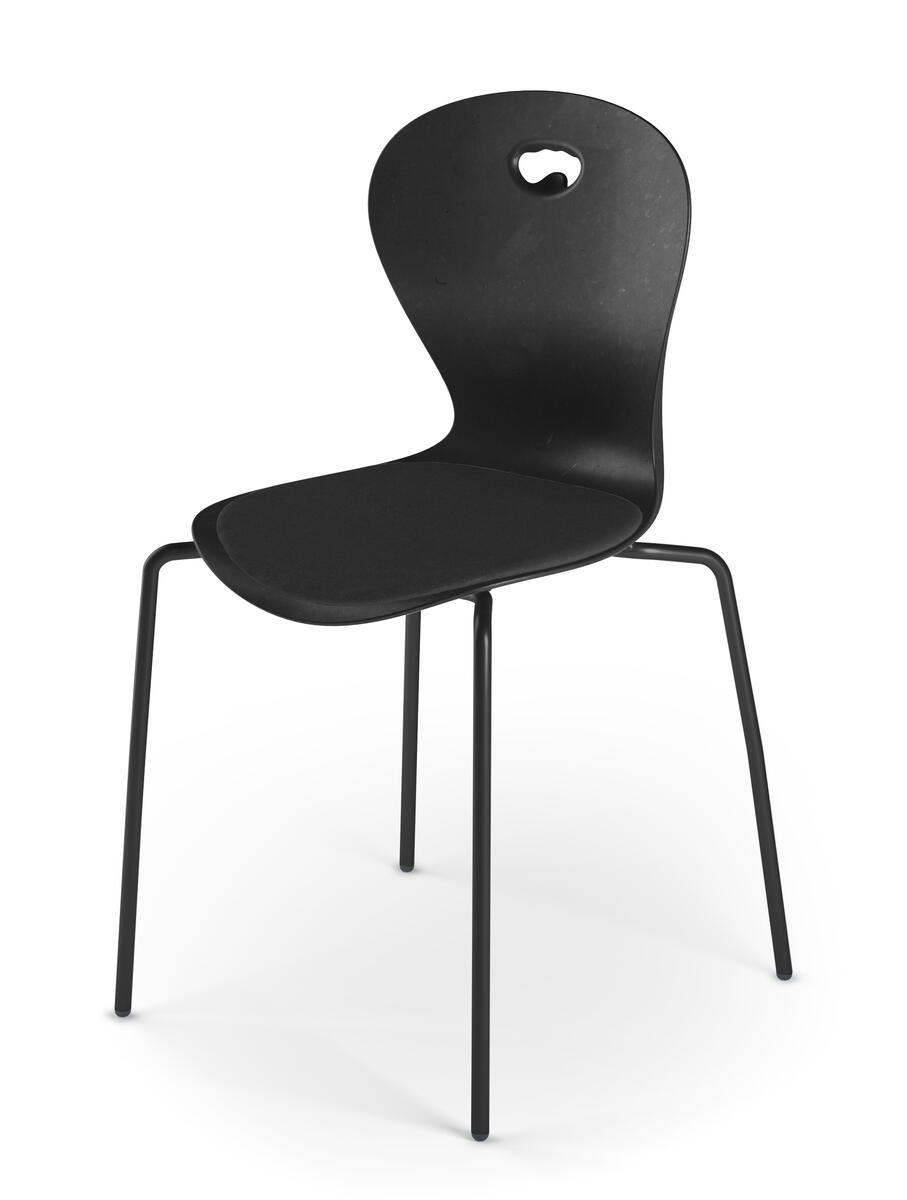 Skal i 100 % genbrugsplast. Stolen opfylder den europæiske standard EN 1729-1, størrelse 5-6, der stiller krav til, at brugere med en højde på 146-188 cm sidder godt og ergonomisk korrekt på stolen. Med taskekrog bagpå. Kan stables og hænges op, når man vender den. Let at rengøre. Sortlakeret understel RAL 9005. Mål: Siddehøjde 45 cm. Sædebredde 42 cm. Sædedybde 40 cm. Sædepolstring i 100 % genanvendt materiale kan tilvælges.