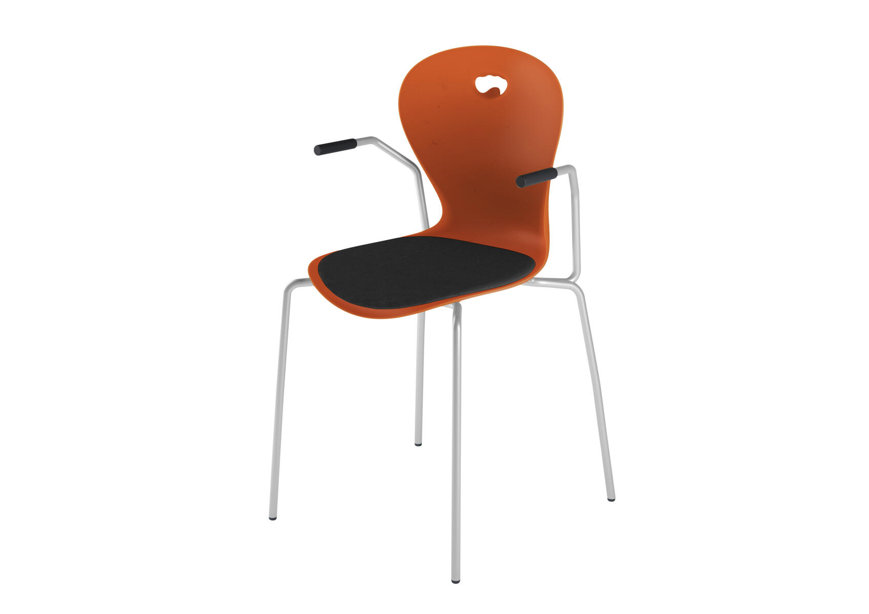 Skal i 100 % genbrugsplast. Stolen opfylder den europæiske standard EN 1729-1&2, størrelse 4-5, der stiller krav til, at brugere med en højde på 133-176 cm sidder godt og ergonomisk korrekt på stolen. Med taskekrog bagpå. Kan stables og hænges op, når man vender den. Let at rengøre. Sølvlakeret understel RAL 9006.