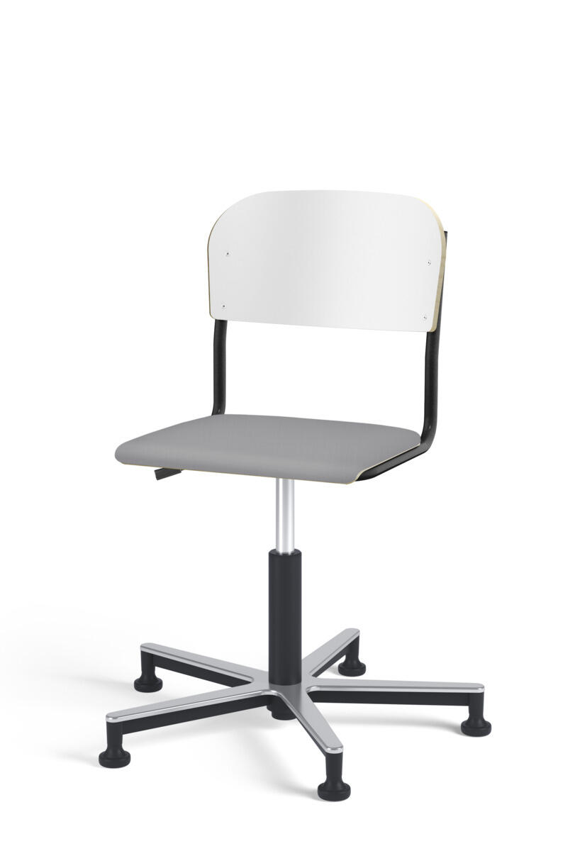 Stol Matte med gasfjeder til regulering af siddehøjden ved hjælp af et håndtag. Sæde og ryglæn i højtrykslaminat. Stel til sæde og ryglæn i pulverlakeret stål, hvid. Kryds i aluminium med glidesko. Som et tilvalg kan sædet betrækkes med Xtreme Padang YS145 (100 % polyester).