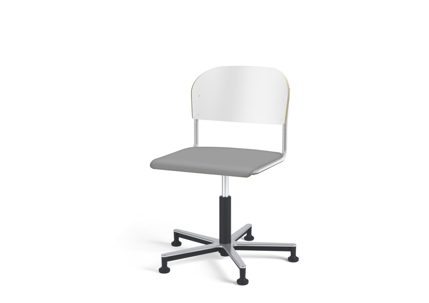 Stol Matte med gasfjeder til regulering af siddehøjden ved hjælp af et håndtag. Sæde og ryglæn i højtrykslaminat. Stel til sæde og ryglæn i pulverlakeret stål, hvid. Kryds i aluminium med glidesko. Som et tilvalg kan sædet betrækkes med Xtreme Padang YS145 (100 % polyester).