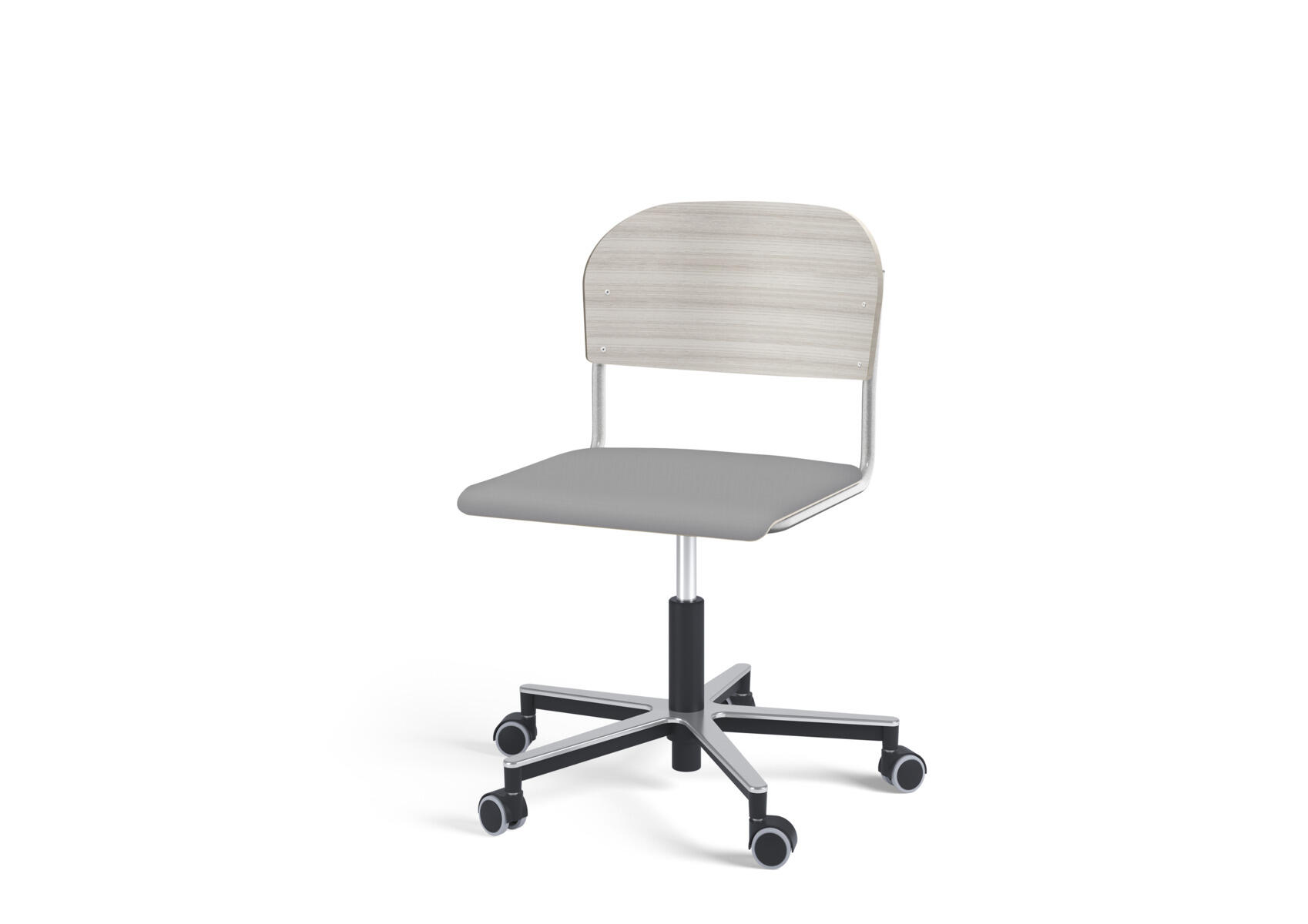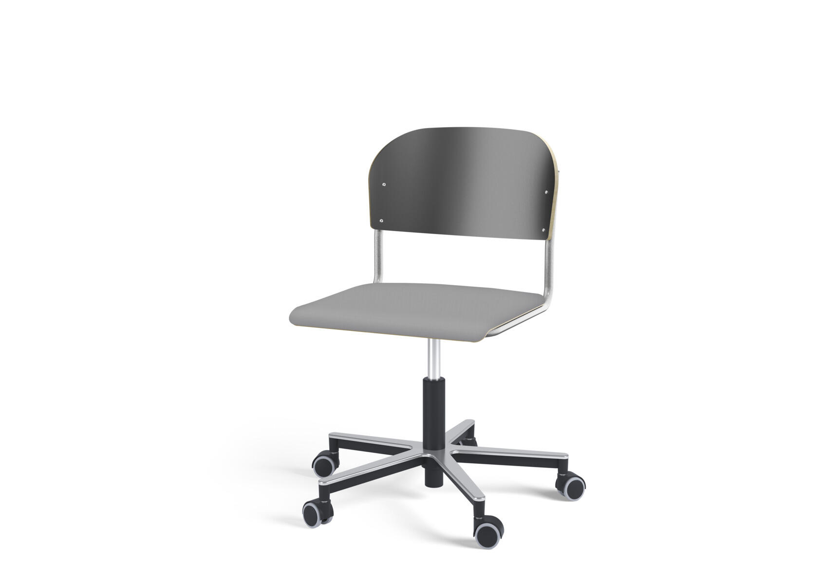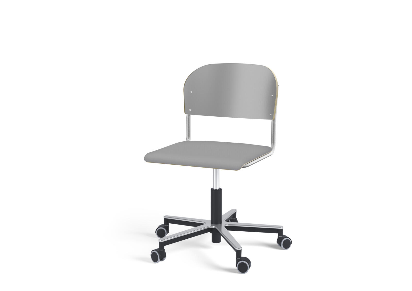 Matte stol med gasfjeder til regulering af siddehøjde ved hjælp af en spak. Sæde og ryg i højtrykslaminat. Stel i pulverlakeret stål, sølv. Kryds i aluminium med hjul. Som et tilvalg kan sædet betrækkes med Xtreme Padang YS145 (100% polyester).