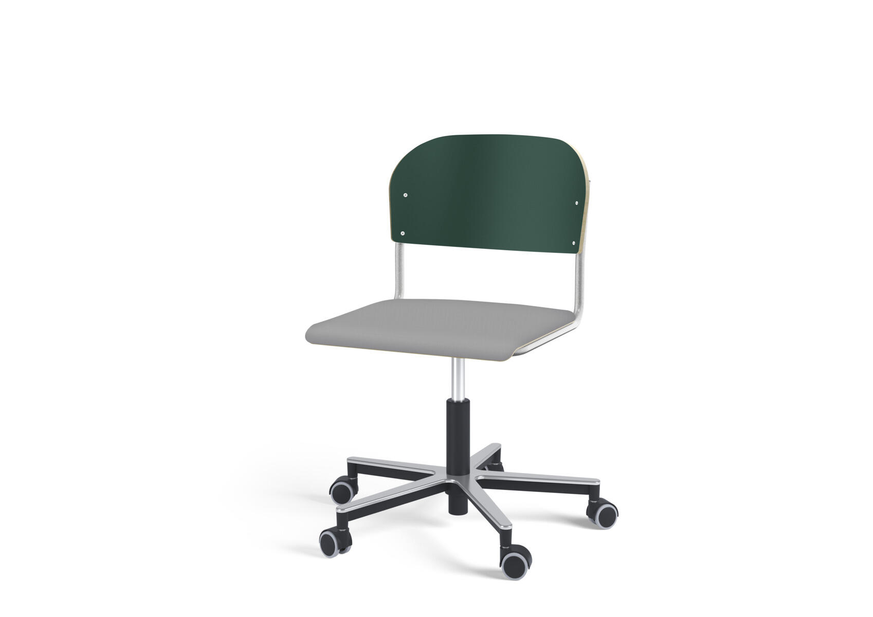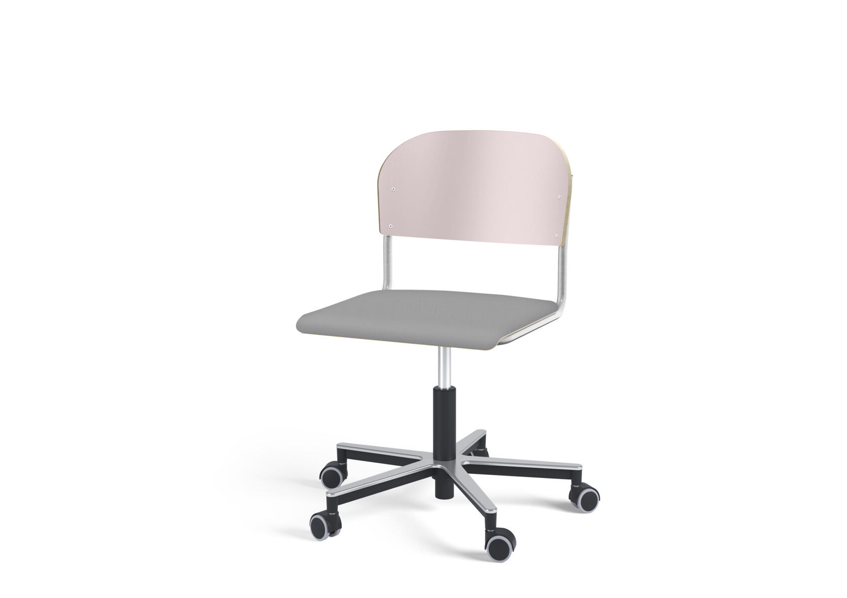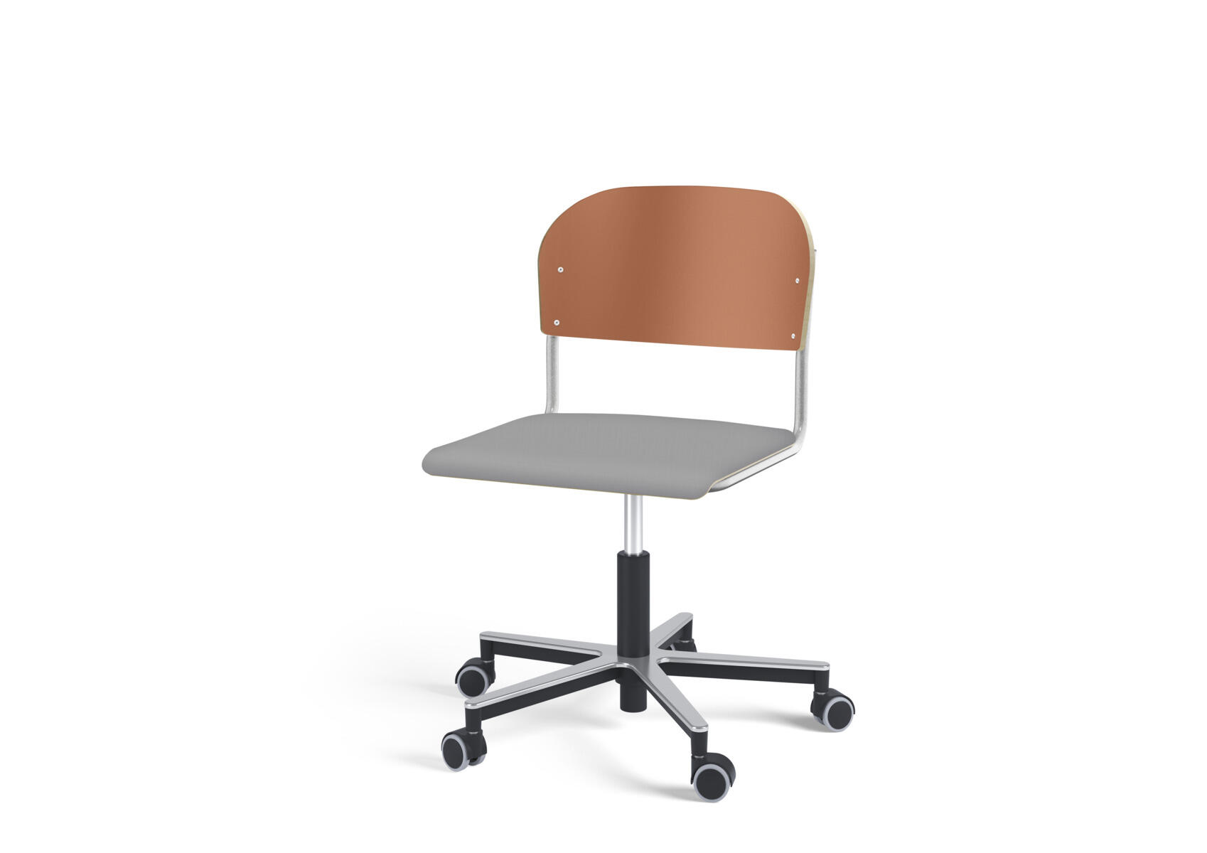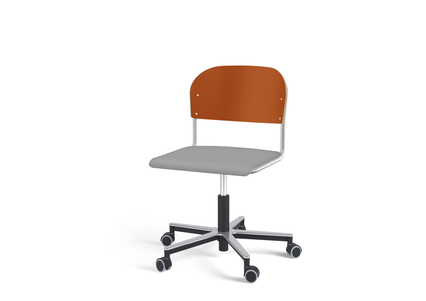 Matte stol med gasfjeder til regulering af siddehøjde ved hjælp af en spak. Sæde og ryg i højtrykslaminat. Stel i pulverlakeret stål, sølv. Kryds i aluminium med hjul. Som et tilvalg kan sædet betrækkes med Xtreme Padang YS145 (100% polyester).