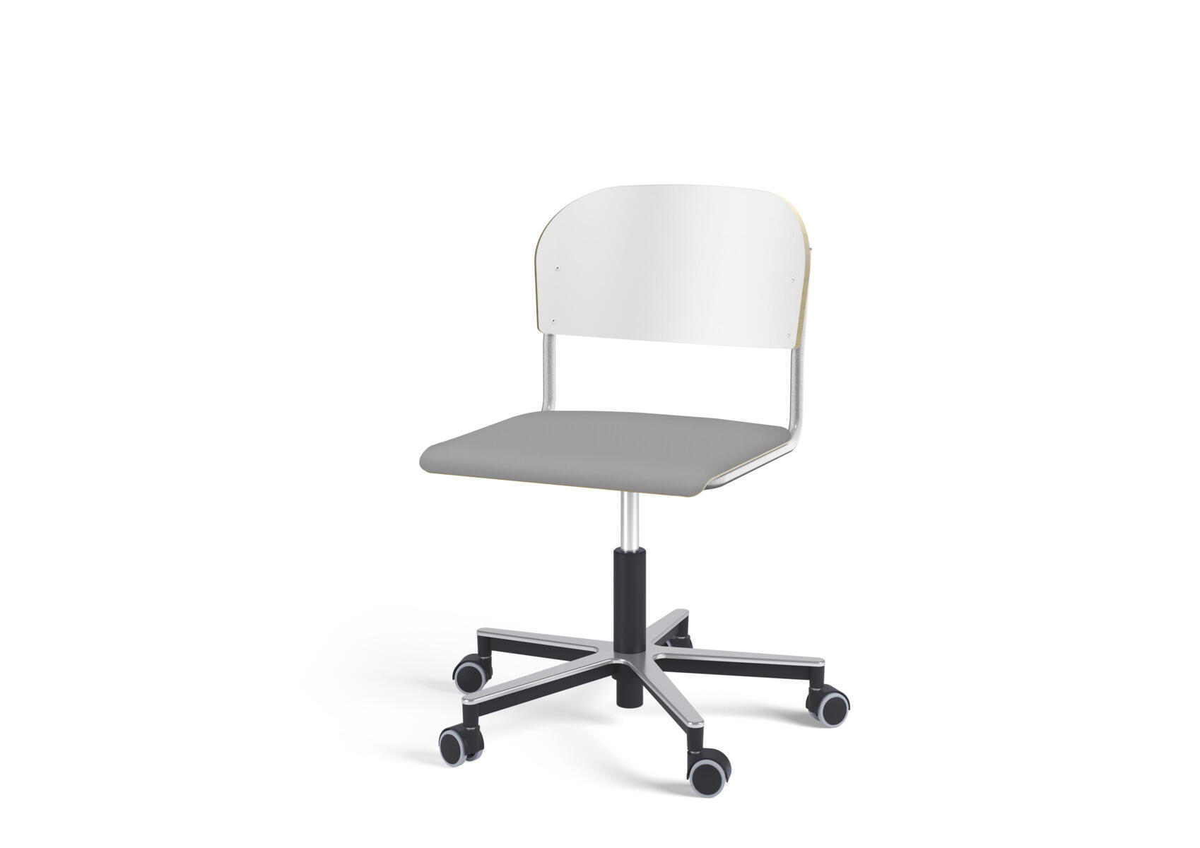 Matte stol med gasfjeder til regulering af siddehøjde ved hjælp af et håndtag. Sæde og ryg i højtrykslaminat. Stel i pulverlakeret stål, hvid. Kryds i aluminium med hjul. Som et tilvalg kan sædet betrækkes med Xtreme Padang YS145 (100% polyester).