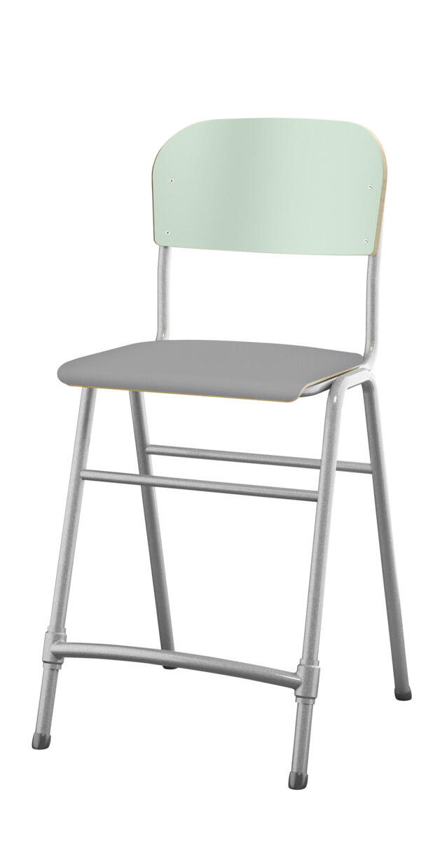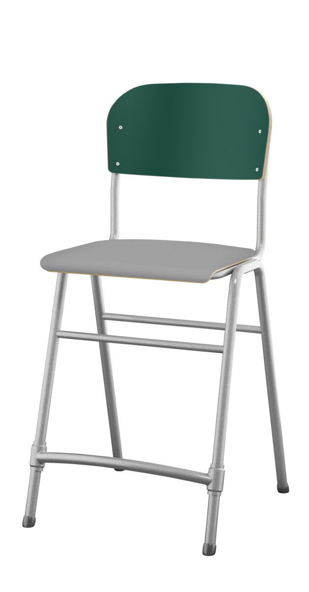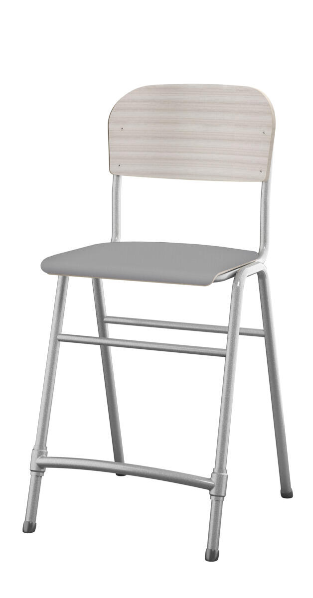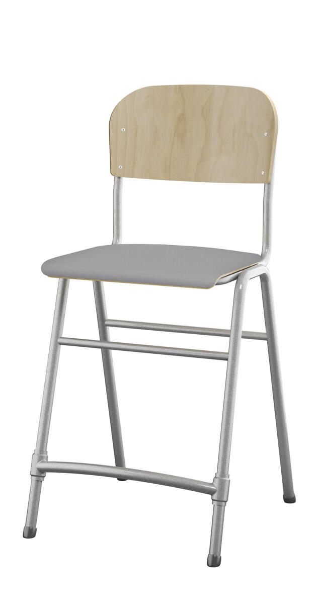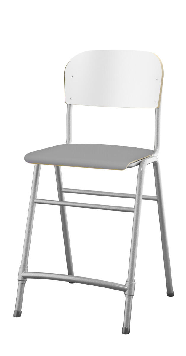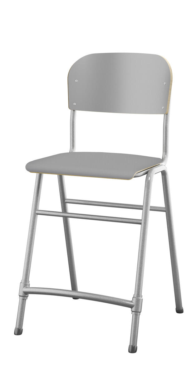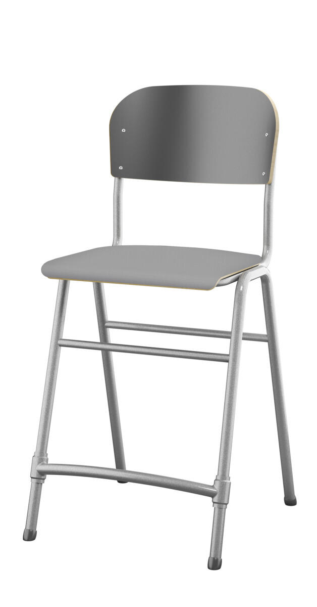 En af vores bestsellere. En klassiker som aldrig går af mode med sit enkle og tidløse design. Sæde og ryg i højtrykslaminat. Sølvlakeret stel, RAL 9006. Siddehøjde 54 cm, siddebredde 36 cm, siddedybde 35 cm. Vægt 5,3 kg. Justerbar fodstøtte. Kan stables (maks. 4 stk. i højden). Med lyddæmpende dupper under fødderne. Lyddæmpende filt med varenr. 35790, som kan fastgøres under sædet, kan bestilles separat.