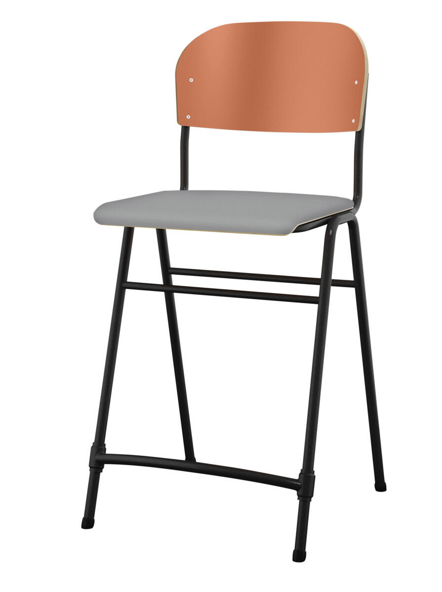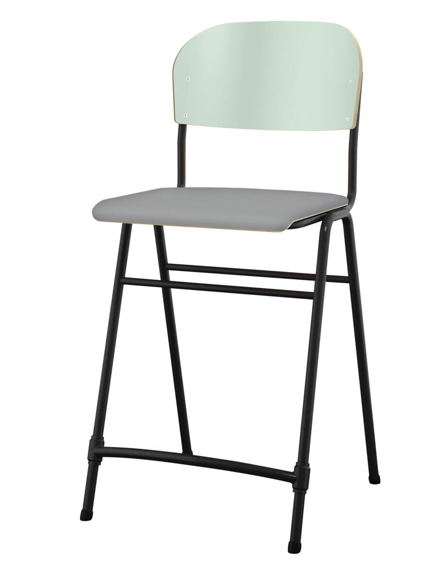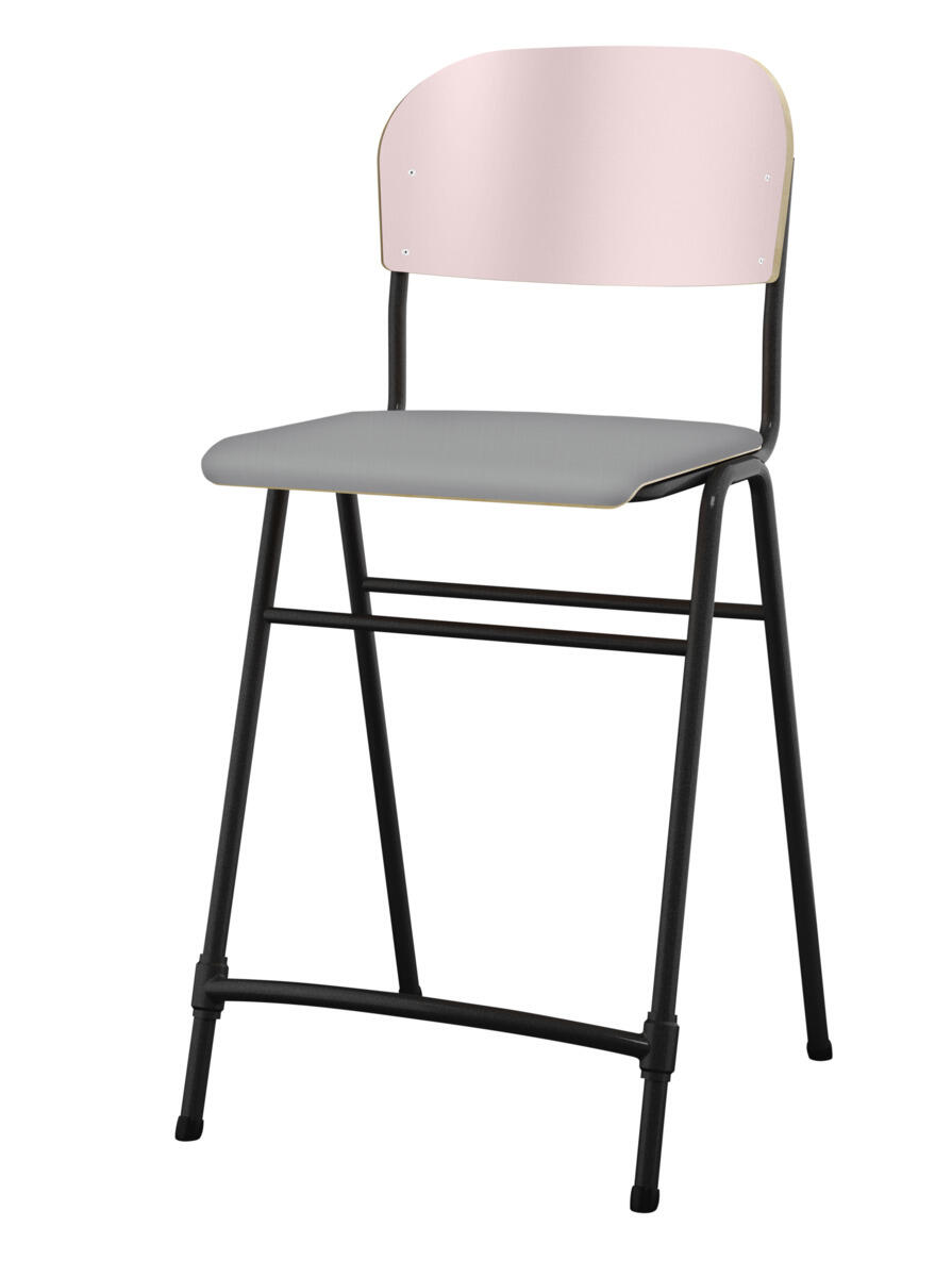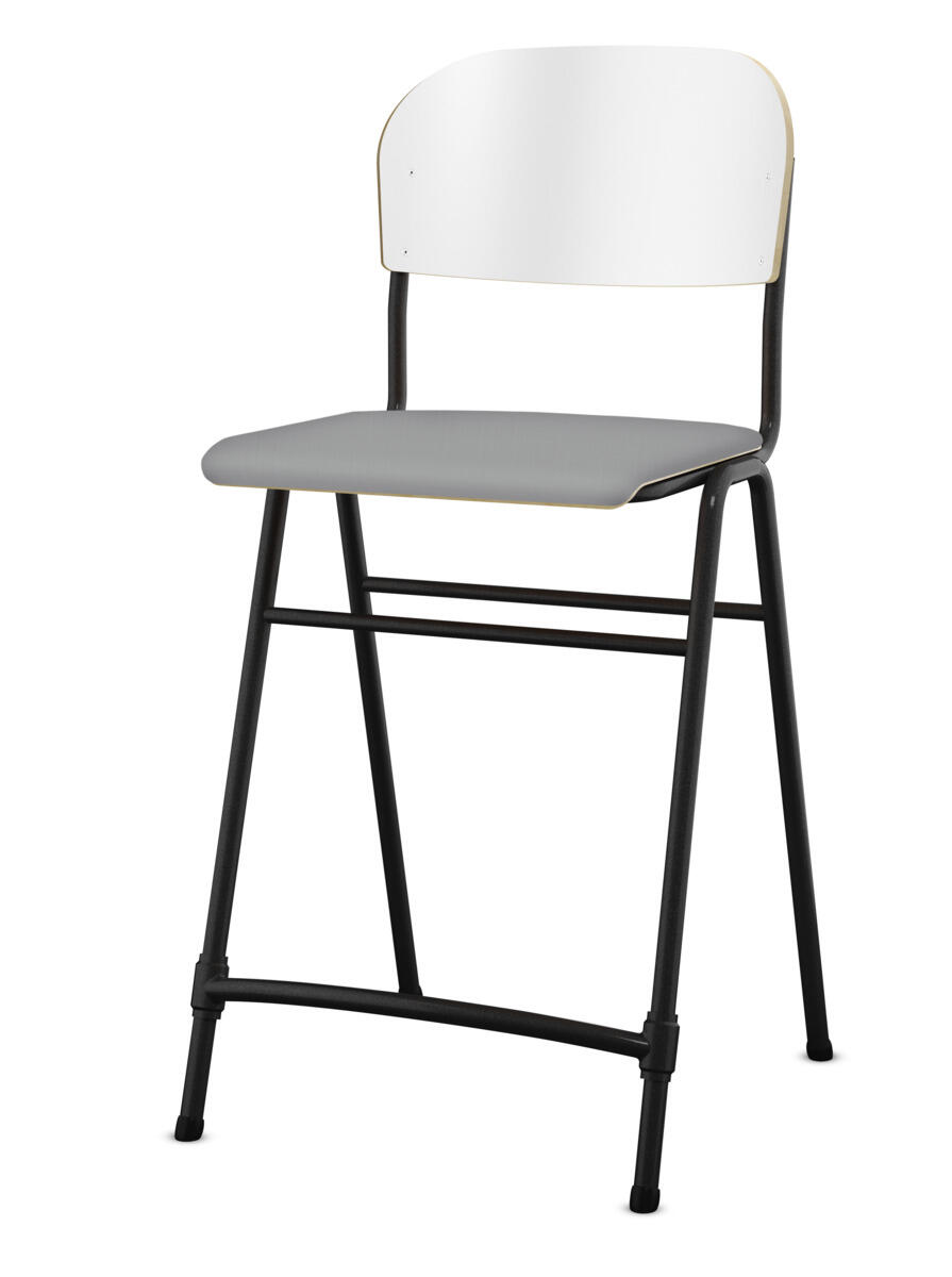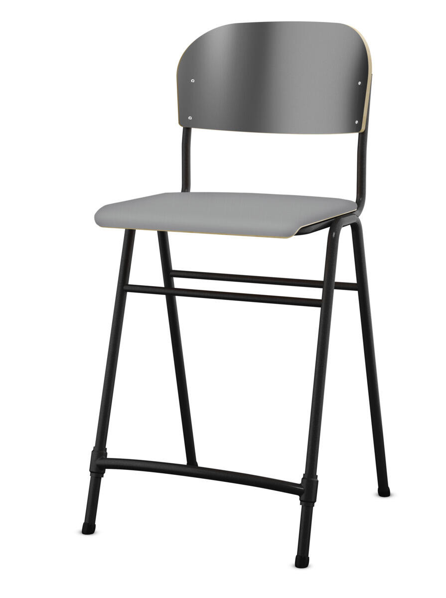 Kan stables. Lyddæmpende dupper. Justerbar fodstøtte. Siddehøjde 65 cm. Sædemål: B42xD39 cm. Vægt 5,3 kg. Sæde og ryg i højtrykslaminat. Sortlakeret stel RAL 9005.