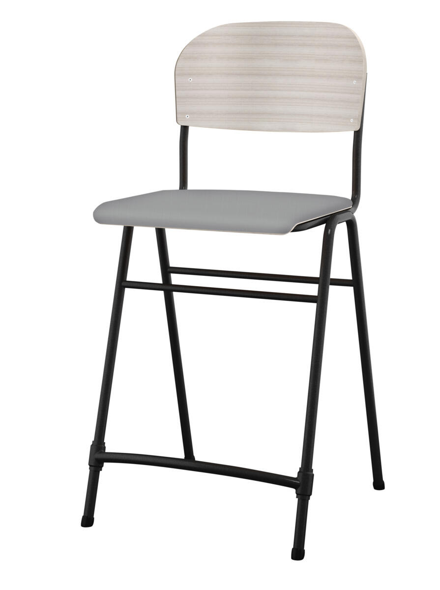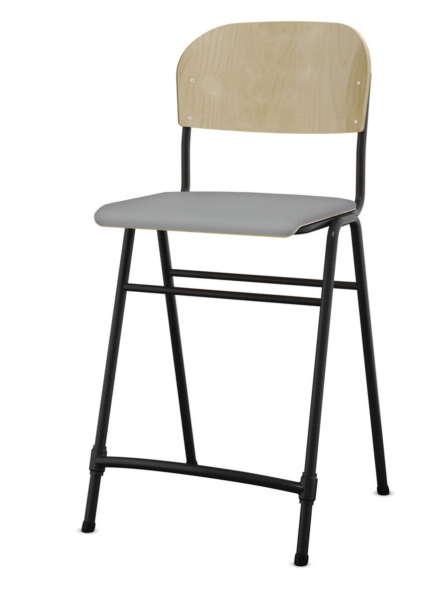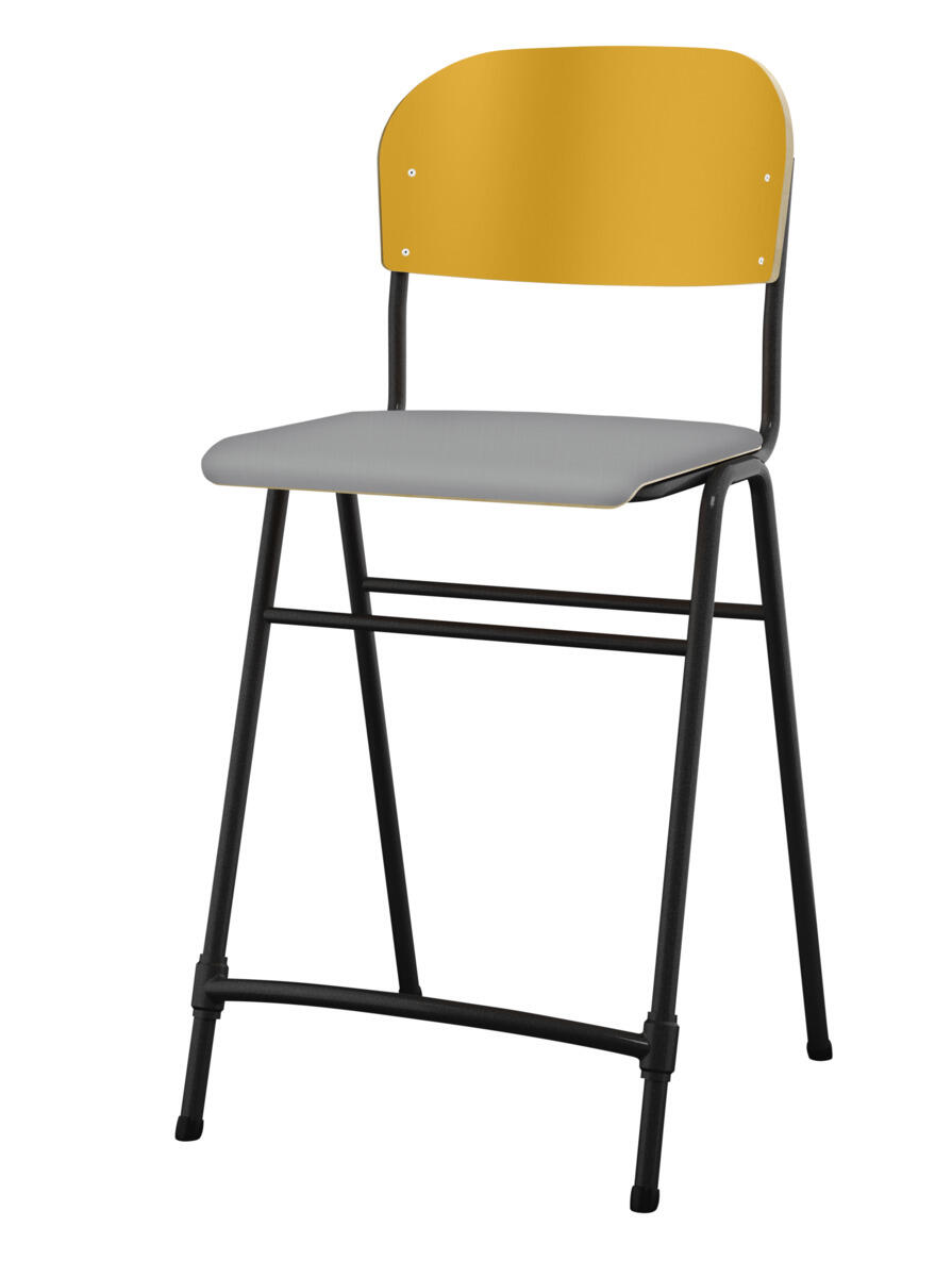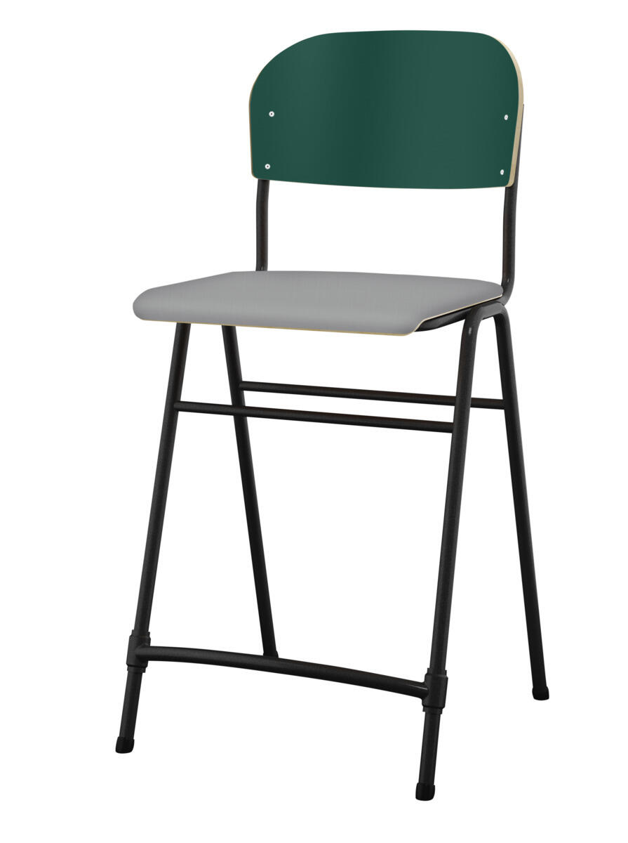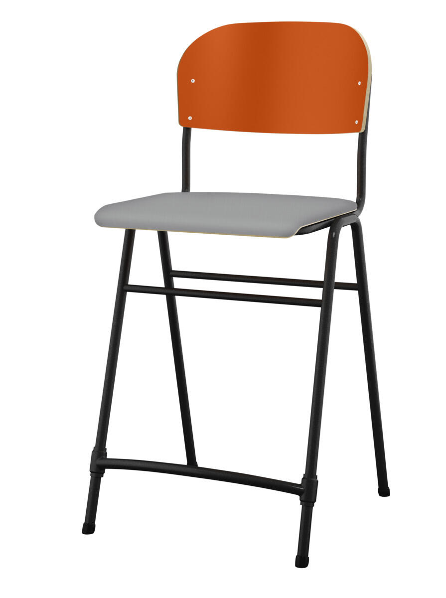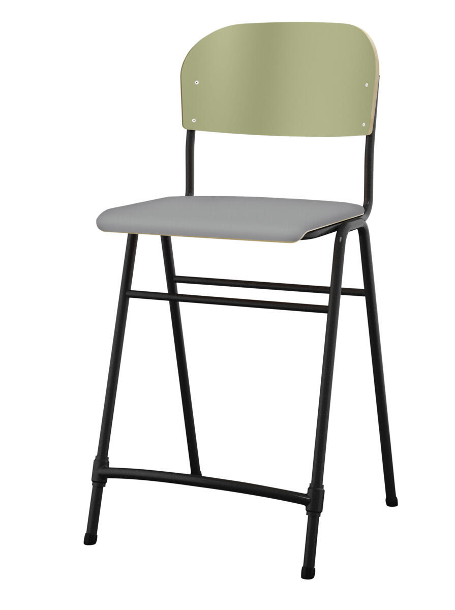 Kan stables. Lyddæmpende dupper. Justerbar fodstøtte. Siddehøjde 65 cm. Sædemål: B42xD39 cm. Vægt 5,3 kg. Sæde og ryg i højtrykslaminat. Sortlakeret stel RAL 9005.