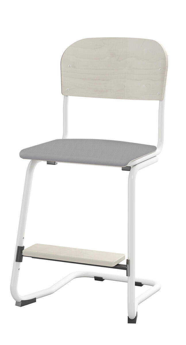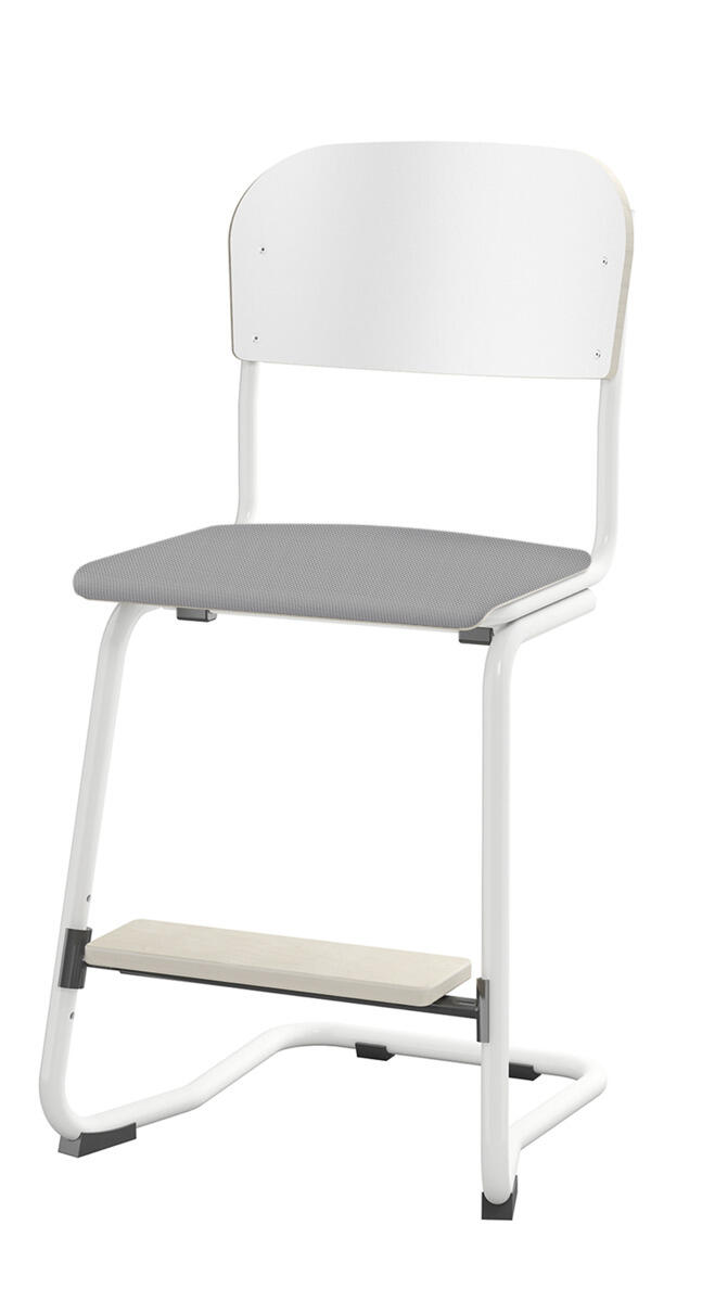 En af vores bestsellere. En klassiker som aldrig går af mode med sit enkle og tidløse design. Sæde og ryg i højtrykslaminat. Hvidlakeret stel, RAL 9003. Siddehøjde 50 cm, siddebredde 36 cm, siddedybde 35 cm. Vægt 4,6 kg. Justerbar fodstøtte i 3 faste højder. Kan stables (maks. 4 stk. i højden) og hænges på bord. Med lyddæmpende dupper under fødderne. Lyddæmpende filt med varenr. 35790, som kan fastgøres under sædet, kan bestilles separat.