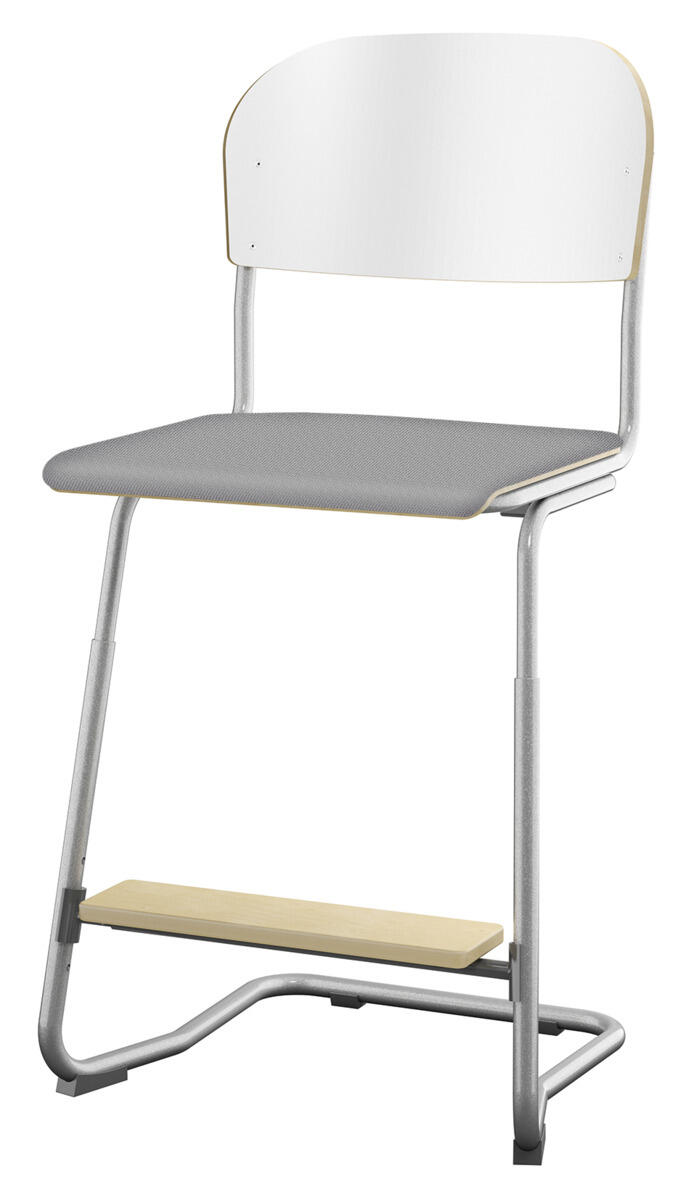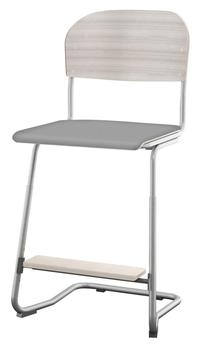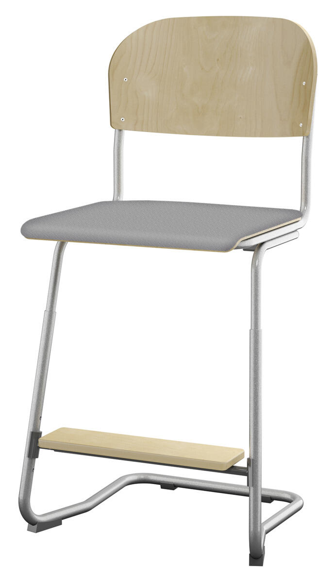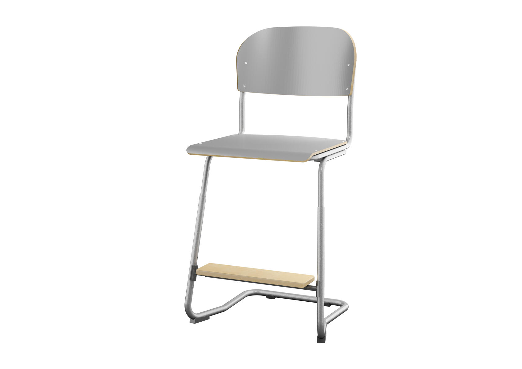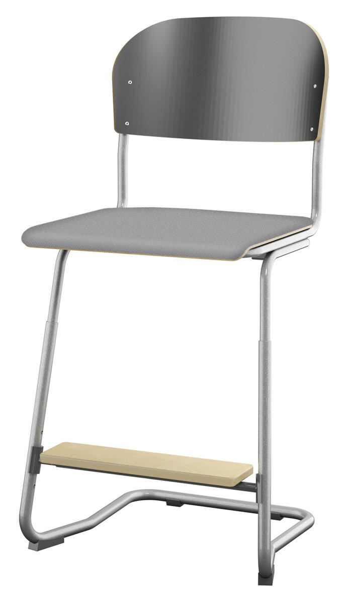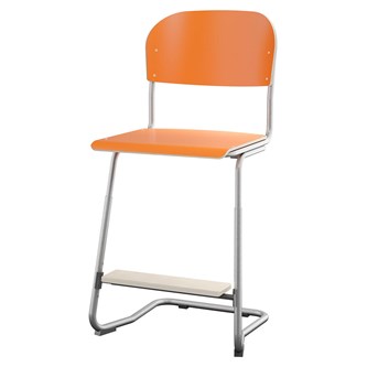 En af vores bestsellere. En klassiker som aldrig går af mode med sit enkle og tidløse design. Sæde og ryg i højtrykslaminat. Sølvlakeret stel, RAL 9006. Siddehøjde 57 cm, 60 eller 63, siddebredde 36 cm, siddedybde 35 cm. Højden justeres ved hjælp af to skruer, som sidder i benene. Vægt 6,4 kg. Justerbar fodstøtte i 3 faste højder. Kan stables (maks. 4 stk. i højden) og hænges på bord. Med lyddæmpende dupper under fødderne. Lyddæmpende filt med varenr. 35790, som kan fastgøres under sædet, kan bestilles separat.