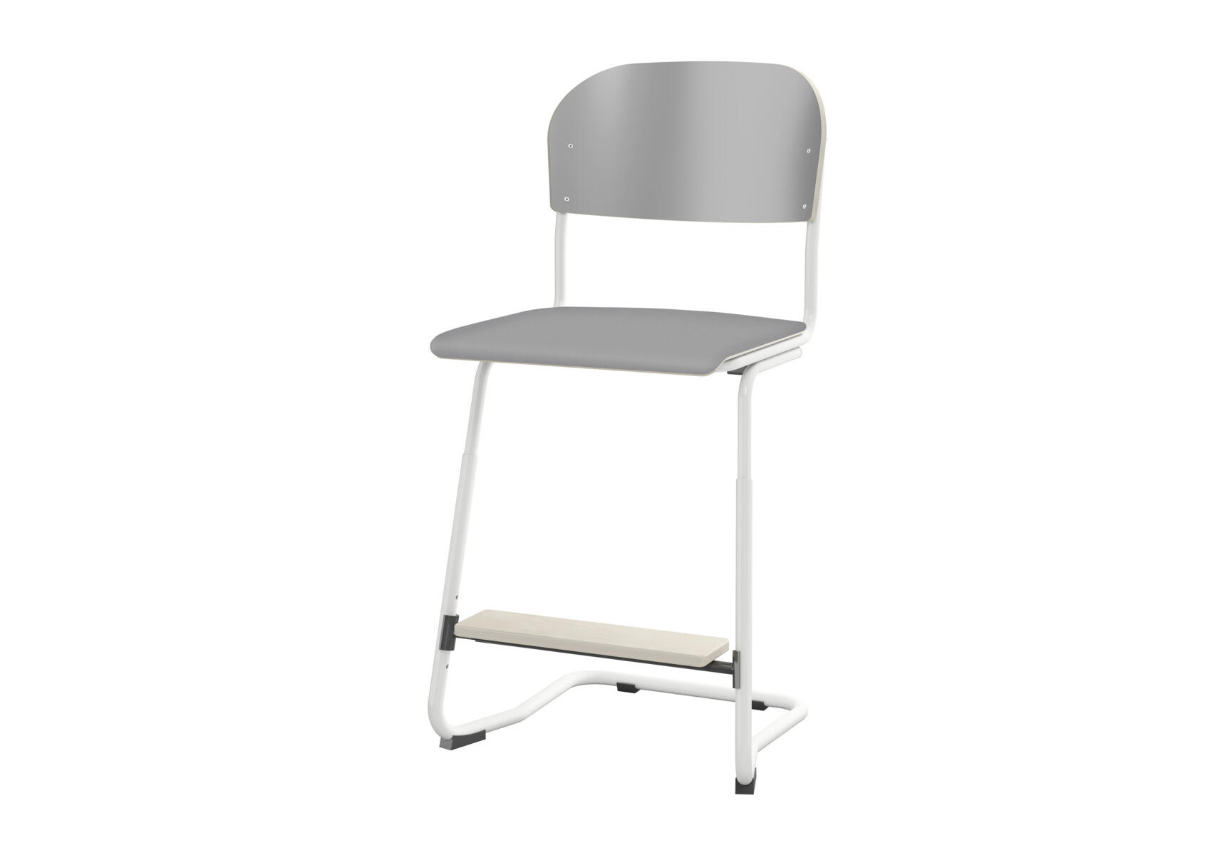 En af vores bestsellere. En klassiker som aldrig går af mode med sit enkle og tidløse design. Sæde og ryg i højtrykslaminat. Sølvlakeret stel, RAL 9006. Siddehøjde 57 cm, 60 eller 63, siddebredde 36 cm, siddedybde 35 cm. Højden justeres ved hjælp af to skruer, som sidder i benene. Vægt 6,4 kg. Justerbar fodstøtte i 3 faste højder. Kan stables (maks. 4 stk. i højden) og hænges på bord. Med lyddæmpende dupper under fødderne. Lyddæmpende filt med varenr. 35790, som kan fastgøres under sædet, kan bestilles separat.