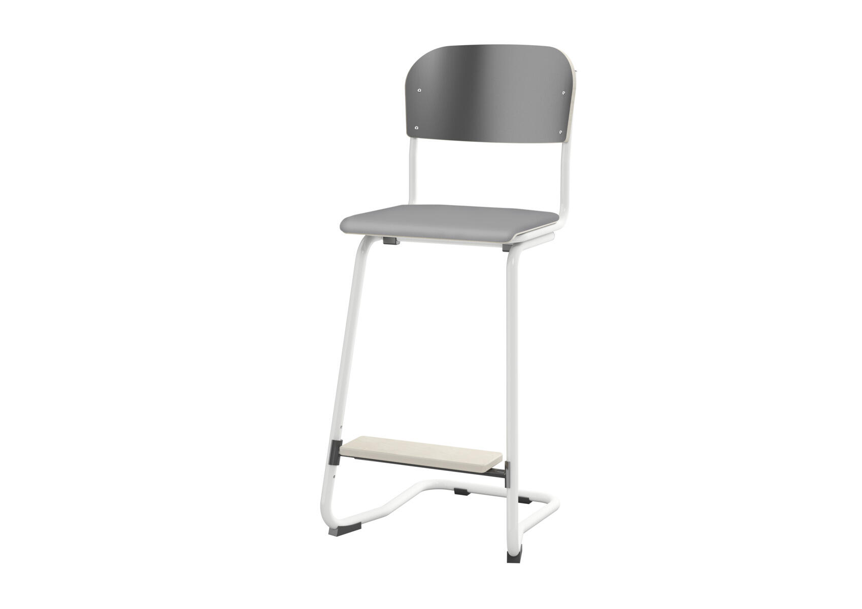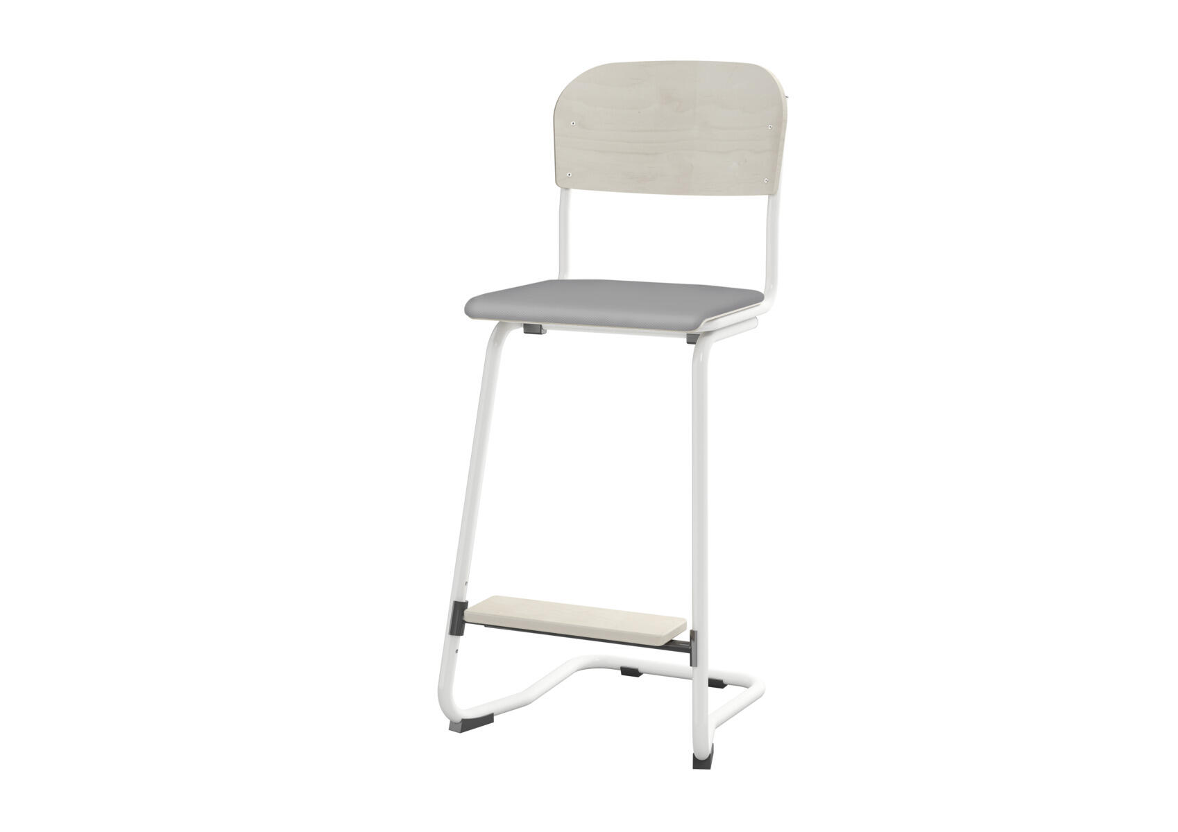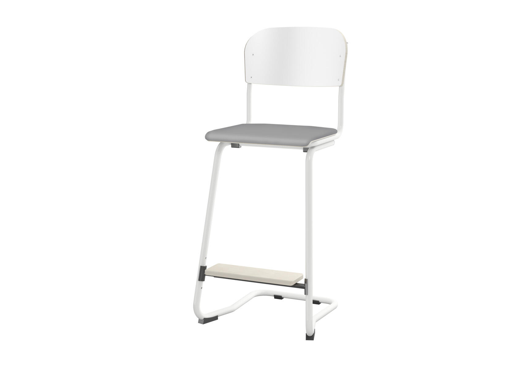 Stabelbar (maks. 4 stk. i højden). Med lyddæmpende dupper under fødderne. Kan hænges på bordet. Justerbar fodplade i 3 faste højder. Siddehøjde: 63 cm. Sædemål: B42xD39 cm. Stellets totaldybde er 54 cm. Vægt 7,4 kg. Sæde og ryg i højtrykslaminat. Hvidlakeret stel RAL 9003. Som et tilvalg kan sædet betrækkes med Xtreme Padang YS145 (100% polyester).