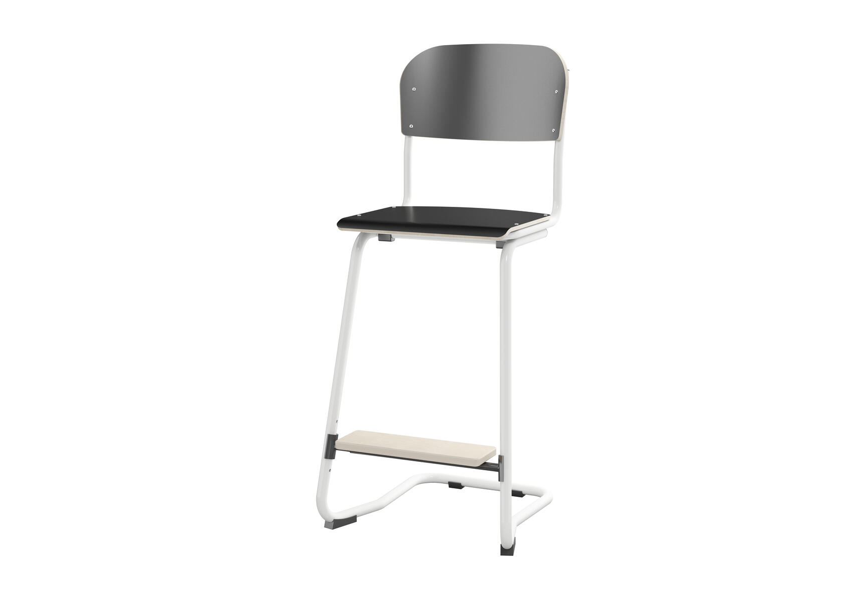 Kan stables (maks. 4 stole). Lyddæmpende dupper. Kan hænges op på et bord. Justerbar fodstøtte i 3 faste højder. Siddehøjde 63 cm. Sædemål: B36xD35 cm. Totaldybde på stel 54 cm. Vægt 6,8 kg. Sæde og ryg i højtrykslaminat. Sortlakeret stel RAL 9005.