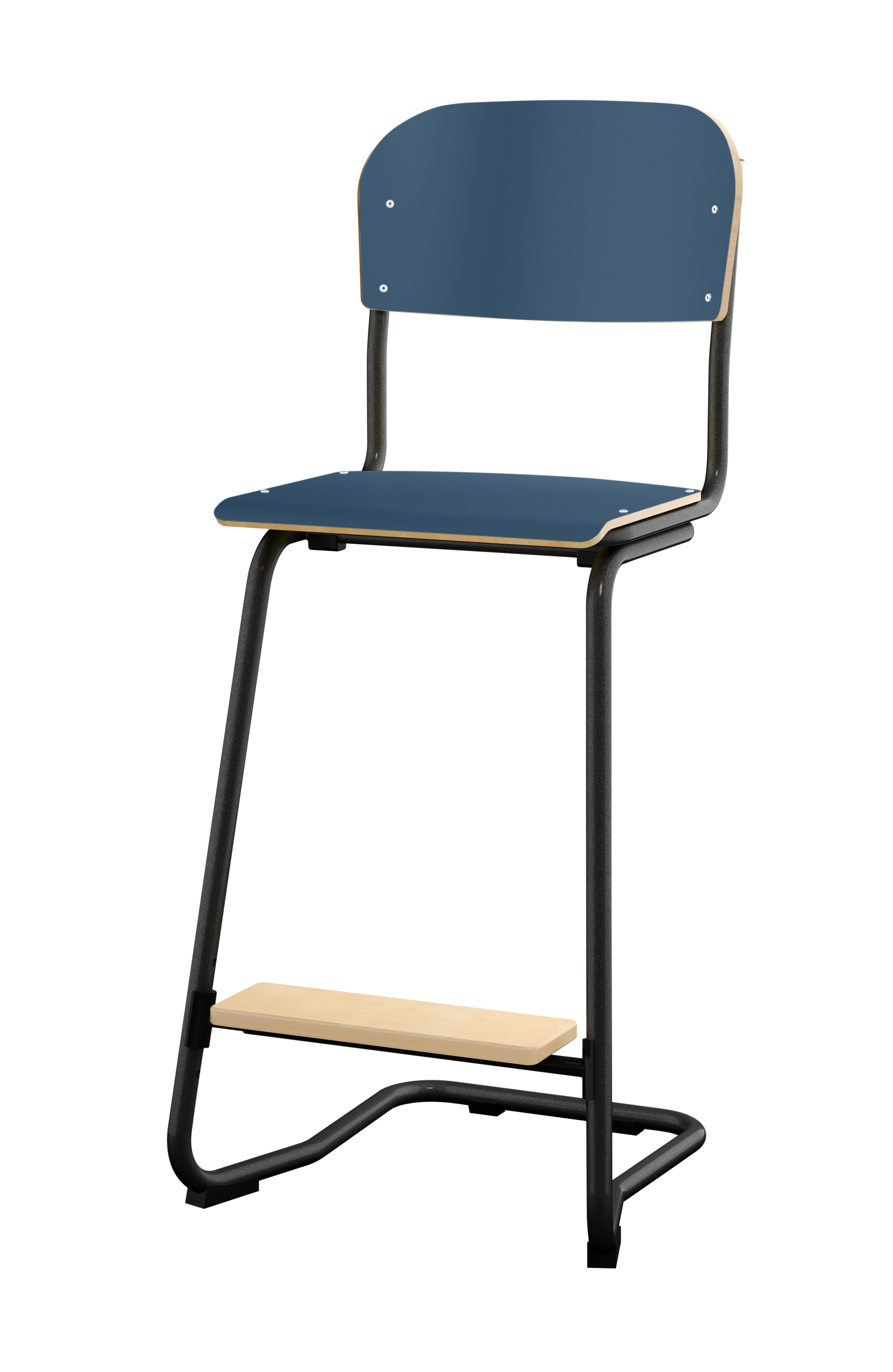 Kan stables (maks. 4 stole). Lyddæmpende dupper. Kan hænges op på et bord. Justerbar fodstøtte i 3 faste højder. Siddehøjde 63 cm. Sædemål: B36xD35 cm. Totaldybde på stel 54 cm. Vægt 6,8 kg. Sæde og ryg i højtrykslaminat. Sortlakeret stel RAL 9005.